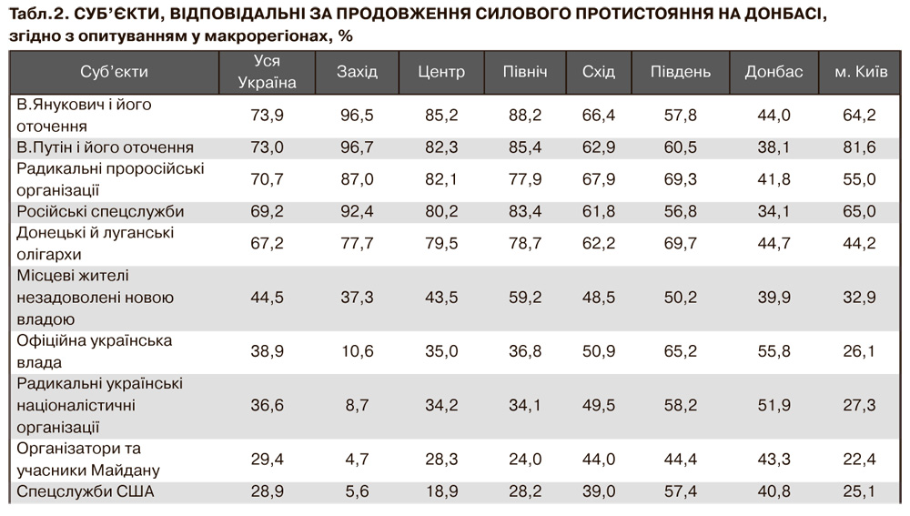 - Серед відповідальних за нинішнє протистояння громадська думка насамперед визначає проросійський вплив, Януковича, Путіна, і в цьому ряду, на рівні двох третин, - донецьких і луганських олігархів. Донбас лояльніший до своїх олігархів, як, утім, і до Януковича - на рівні 44%. Імовірно, для жителів Донбасу це приблизно одні й ті самі люди... Для Донбасу на першому місці з тих, хто викликає невдоволення, - радикальні українські націоналістичні організації і/або офіційна українська влада. І ця позиція зрозуміла - для багатьох це "не їхня влада", про участь у голосуванні під час позачергових президентських виборів згадали лише близько чверті опитаних...