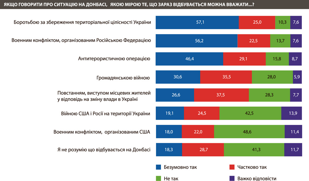 - Те, що зараз відбувається у зв'язку з ситуацією на Донбасі, наші люди вважають: боротьбою за збереження територіальної цілісності України (це беззастережно так для 57% і частково - для 25%); воєнним конфліктом, організованим Російською Федерацією (беззастережно так - для 56% і частково так - для 22,5%); антитерористичною операцією (безумовно так - для 46 і частково так - для 29%); громадянською війною (беззастережно так - для 31% і частково так - для 35,5%); повстанням, виступом місцевих жителів у відповідь на зміну влади в Україні (беззастережно так - для 27% і частково так - для 37,5%); війною США і Росії на території України (беззастережно так - для 19% і частково так - для 24,5%); воєнним конфліктом, організованим США (беззастережно так - для 18% і частково так - для 22%). Як уже згадувалося, тільки 41% розуміє, що відбувається на Донбасі. Як у наших людей, зокрема, виник варіант із громадянською війною?