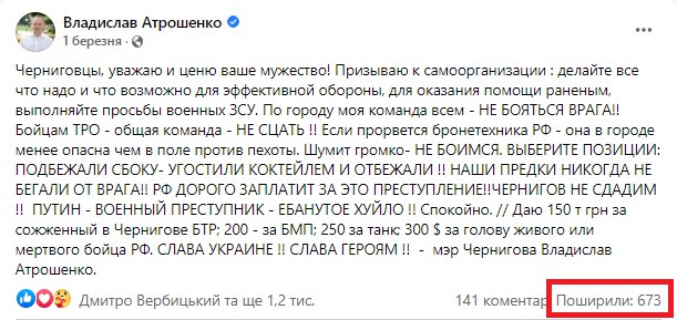 — Останній обстріл був 1 квітня. А перші «Іскандери» били після моїх заяв, коли я закликав чернігівців не боятися ворога, а отримати зброю й захищати рідне місто. Була висока ймовірність вуличних боїв, і я просив людей та бійців ТрО не боятися танків і бронетехніки й застосовувати запалювальну суміш. Ще я тоді пообіцяв грошову винагороду за підбитий танк, БТР або голову російського бійця в разі прориву ворога в місто.
