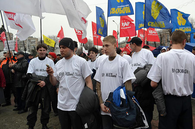На Театральній площі Черкас з'явилася група молодиків у футболках з написами "ВО "Свобода" на спині та гаслами "Бий жидів!" на грудях. Організатори мітингу негайно звернулися до присутніх на заході правоохоронців із вимогою затримати молодиків та вжити всіх необхідних заходів. Проте це завдання для міліції, очевидно, виявилося надто складним.