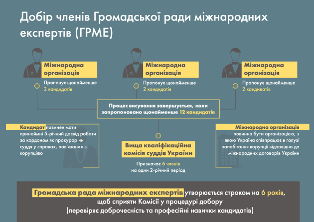 Після обґрунтовано тривалих і змістовних дискусій із міжнародними партнерами з ЄС, США та МВФ в Україні спочатку ухвалили політичне рішення, а потім — 7 червня 2018 року — Закон «Про Вищий антикорупційний суд» (ВАКС). Умовою проведення конкурсу до ВАКС, згідно з законом, було створення Громадської ради міжнародних експертів (ГРМЕ).