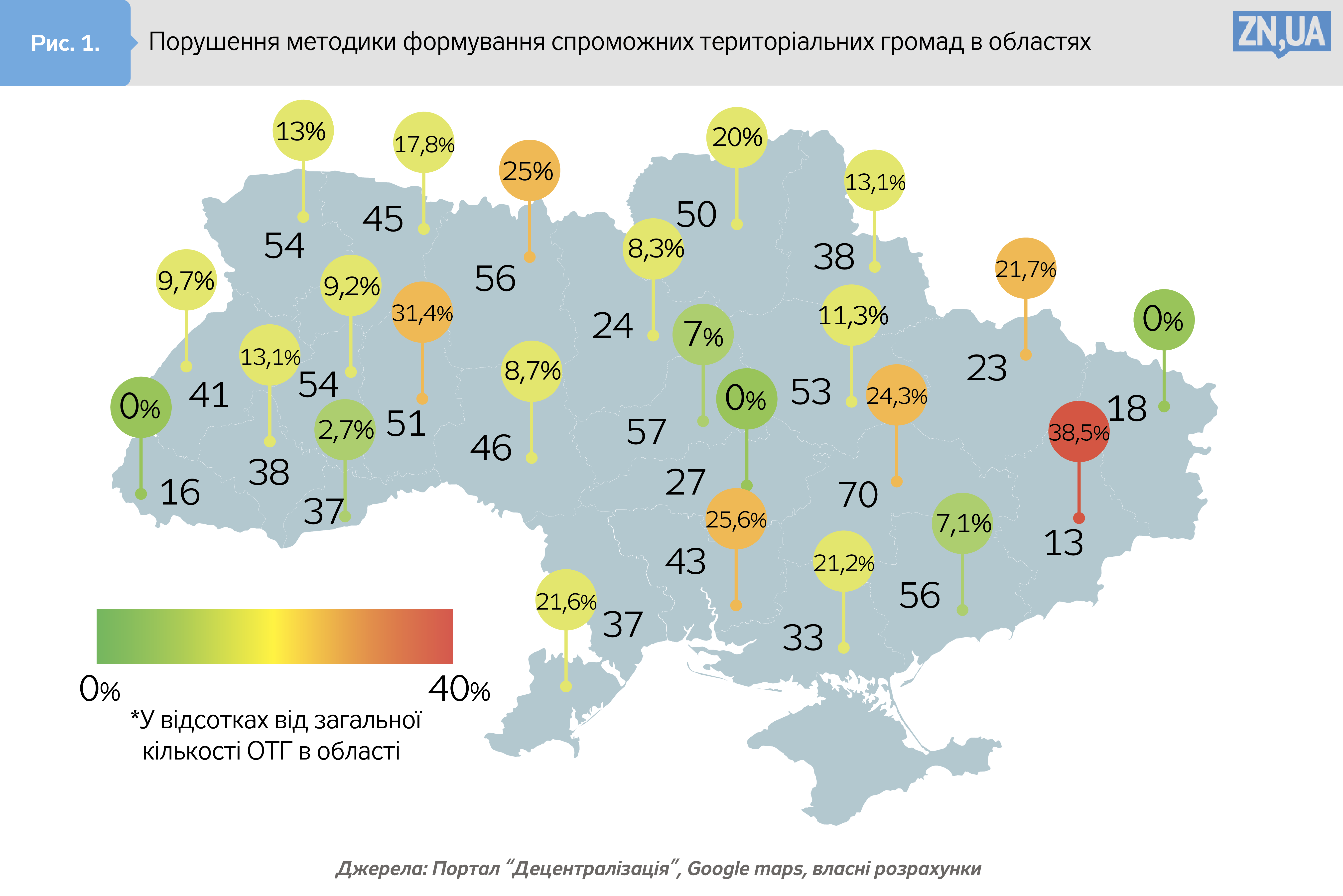 Серед поданих громад першої хвилі також є порушники закладених у законодавстві норм: таких громад налічується 15,4%. Але немає жодної кореляції між рівнем дотаційності бюджетів громад і дотриманням правил формування спроможної об'єднаної територіальної громади. А отже, це ще раз доводить, що норми, закладені в методиці, можуть впливати на реальний потенціал громади лише незначним чином.