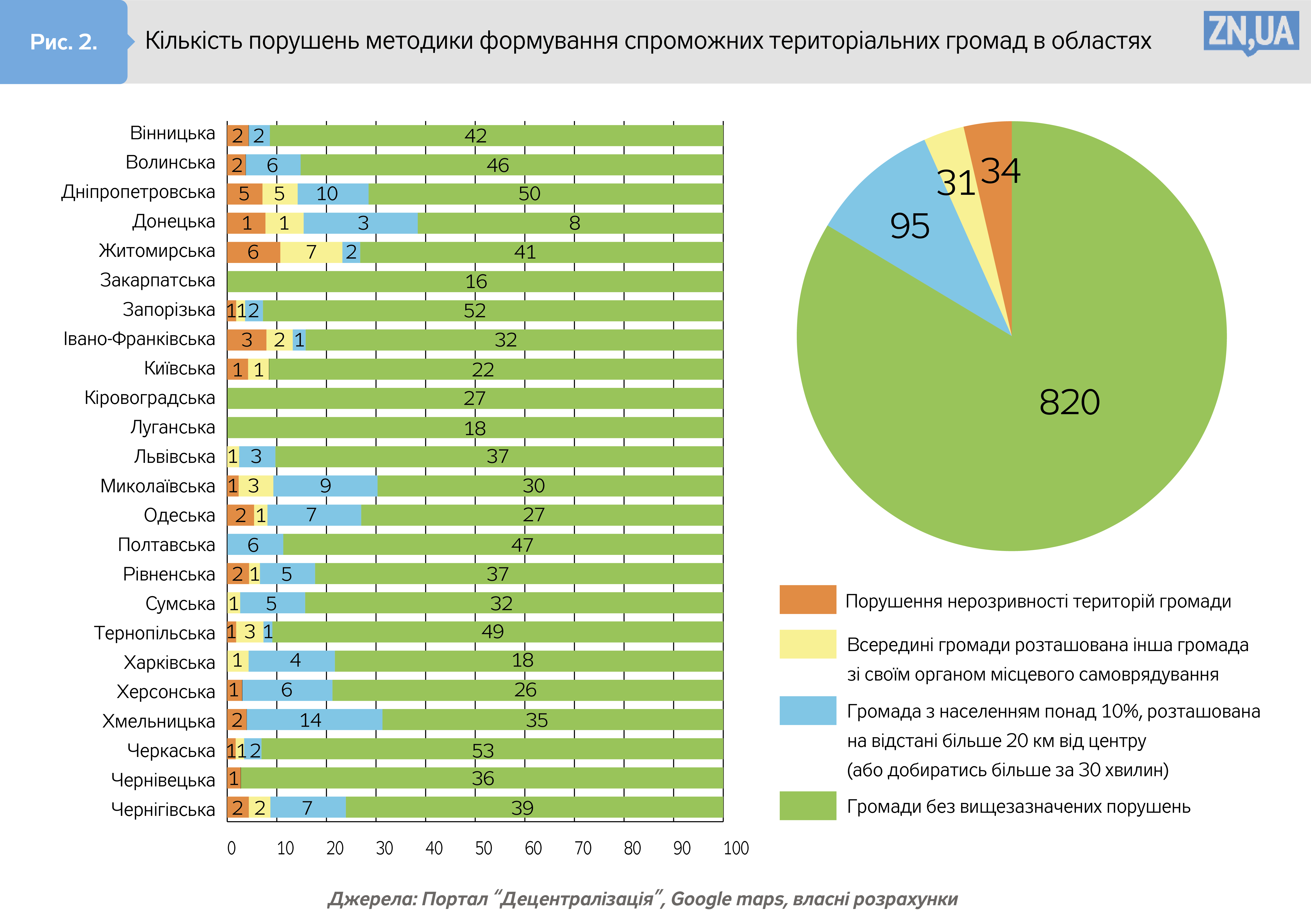 На рисунках 1 і 2 ми бачимо, що умови формування спроможної ОТГ часто порушуються на практиці. І це недивно, адже кількісні показники не пристосовано до реалій України. Громади в деяких західних областях не відповідають умовам лише через ускладнені гірськими масивами шляхи сполучення. Миколаївська та Дніпропетровська області є лідерами серед порушників через неякісні дороги, які унеможливлюють транспортні перевезення від центру ОТГ до віддалених селищ, менші за 30 хвилин. Населені пункти не розташовані щільно один до одного, отже, виникає потреба у формуванні спроможної громади на значних територіях, що ускладнює дотримання стандартів. Виходить, що з об'єктивних причин дотримуються засад формування громад лише найменші або інфраструктурно найрозвиненіші області.