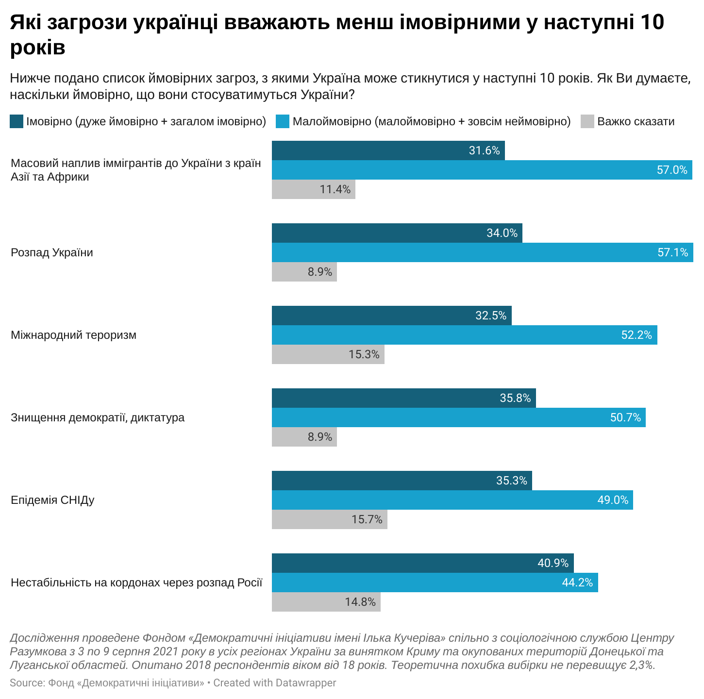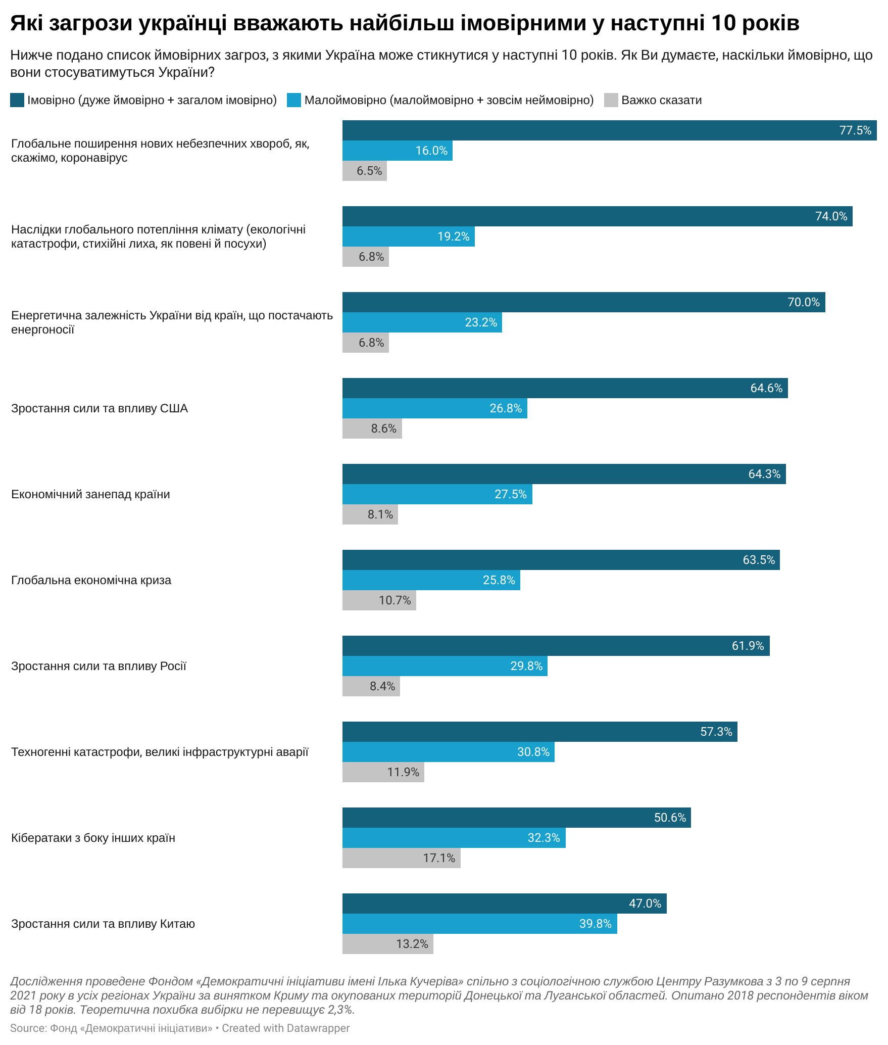 Тому нинішнього року ми вдалися до експерименту: вирішили запитати у співвітчизників, які загрози для України вони бачать на наступні 10 років.