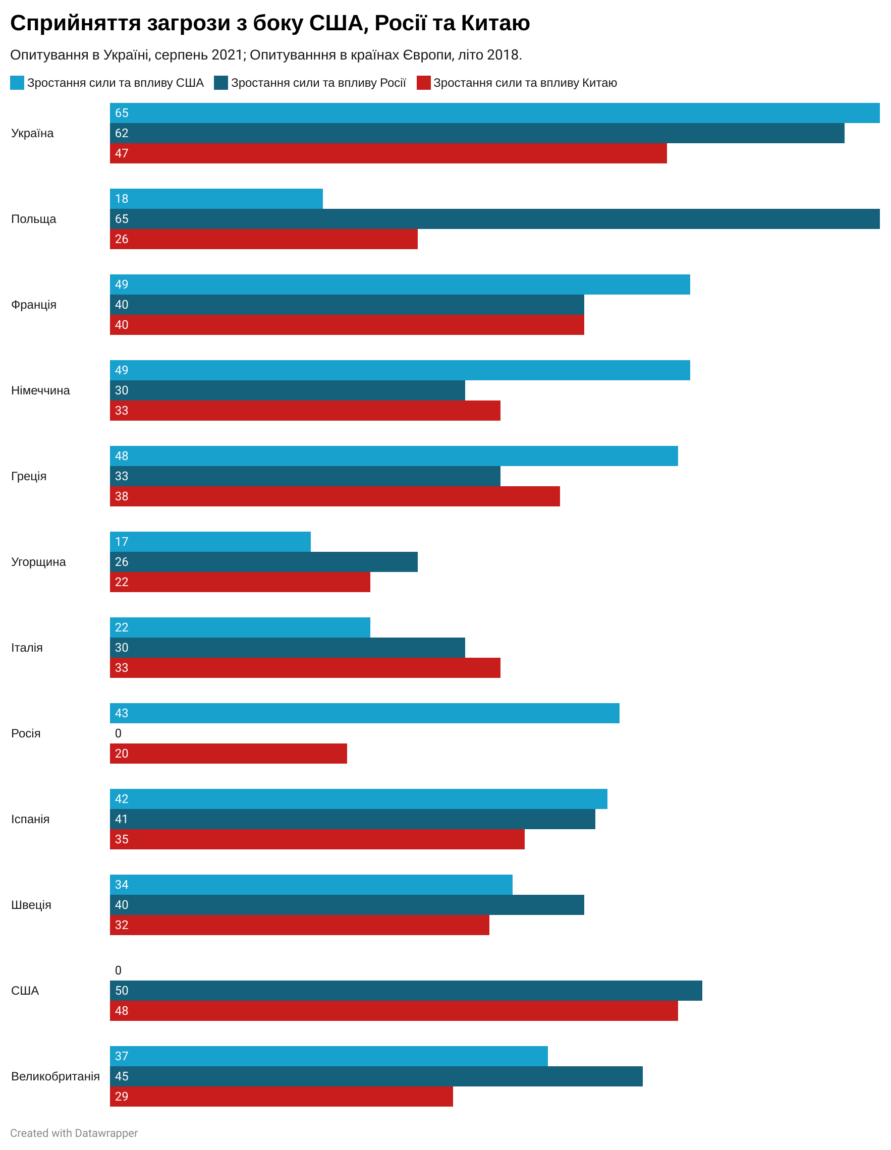 У 2018 році американські соціологи поцікавилися в респондентів із 26 країн, чи сприймають вони зростання впливу та влади США, Росії і Китаю як загрозу. Хоча відтоді в Америці змінився президент, порівняння результатів тодішнього й нашого опитувань дає певну поживу для роздумів.