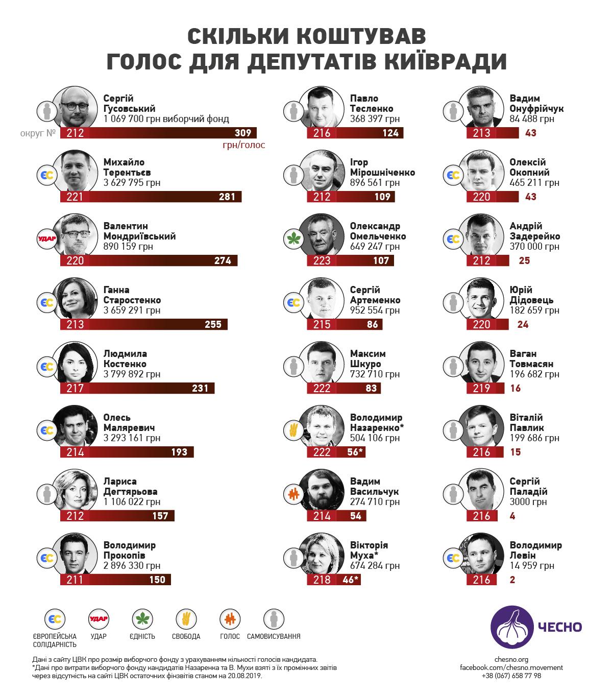 «Ціна» мандата до Київради у 2020 році становила 4779 голосів. Депутатів, які самотужки набрали вдосталь голосів на один мандат, семеро. Шестеро з них були депутатами у 2015–2020 роках.