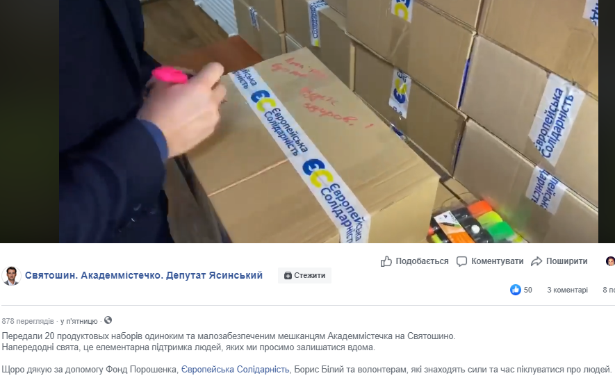 На початку загострення пандемії коронавірусу депутати персонально розносили продуктові набори, брендовані логотипом партії, й від свого імені.