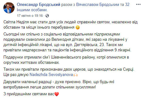 Навіть коли церква публічно заборонила приходити до храмів освячувати паски, депутати йшли й освячували більше тисячі пасок. А «єднівець» Олександр Бродський пригощав великодніми пряниками дітей в інфекційній лікарні, хоча пацієнти інфекційного відділення повинні якнайменше контактувати зі сторонніми людьми.