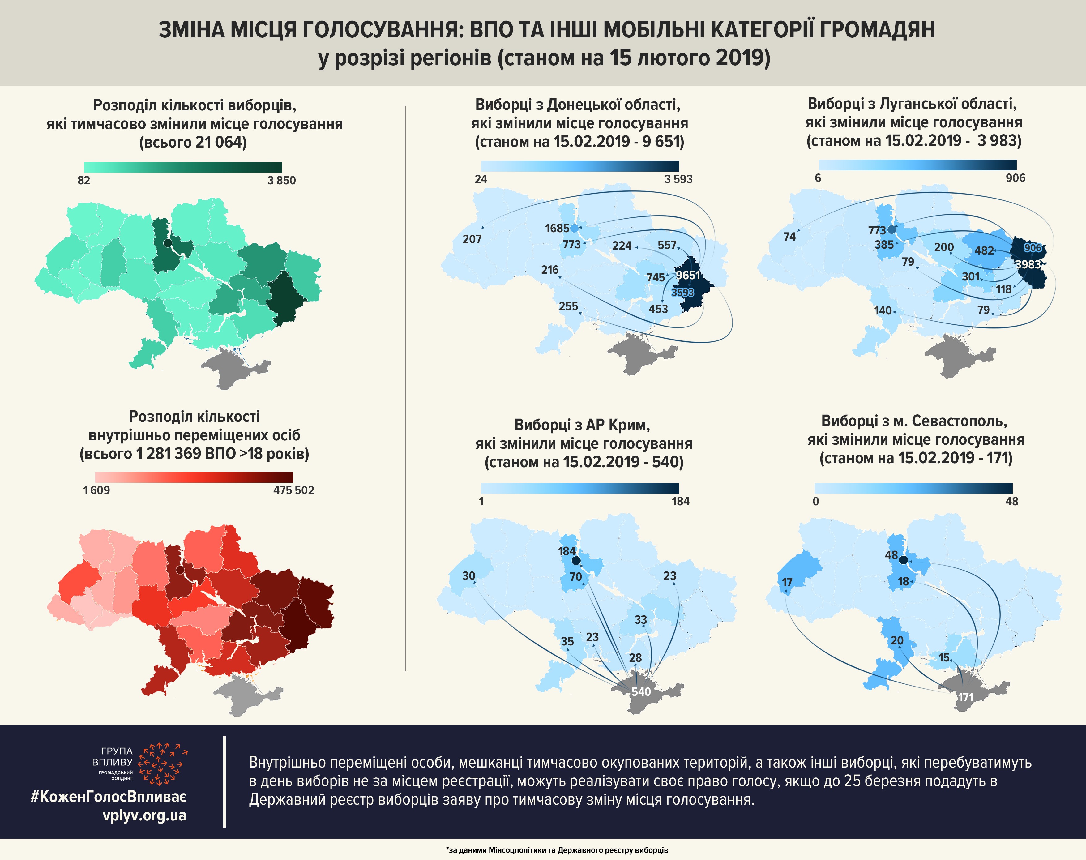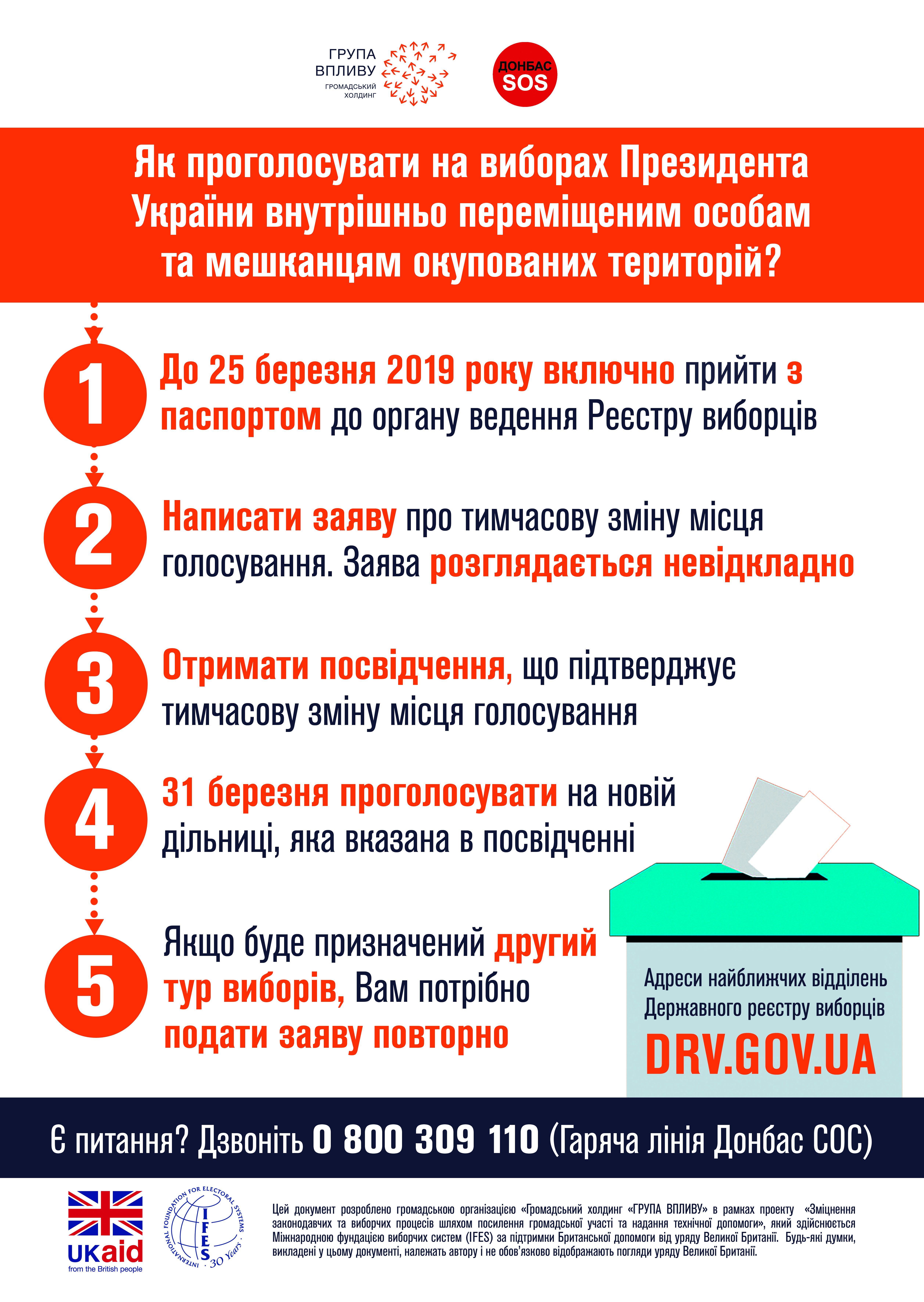 А правозахисні організації тим часом наполегливо рекомендують внутрішньо переміщеним особам не відкладати подання заяви про зміну місця голосування і перевірити себе у списках виборців у приміщенні нової виборчої дільниці (з 23 березня). Тому що #КоженГолосВпливає.