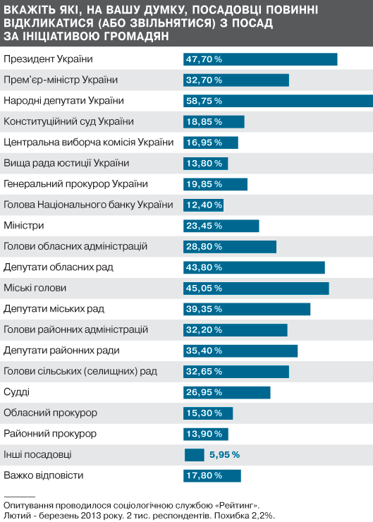 Ситуація в Україні може змінитися тільки за умови формування відповідального суспільства та відповідальної влади. Громадяни змінять своє ставлення до політики та влади і візьмуть на себе відповідальність, коли в їхніх руках будуть реальні й дієвіші інструменти впливу на владу, ніж вибори раз на п'ять років і стихійні бунти. Запровадження інститутів відкликання виборних осіб та вотуму недовіри до призначуваних по вертикалі влади дозволить створити нову систему стримування і противаг між суспільством і державою.
