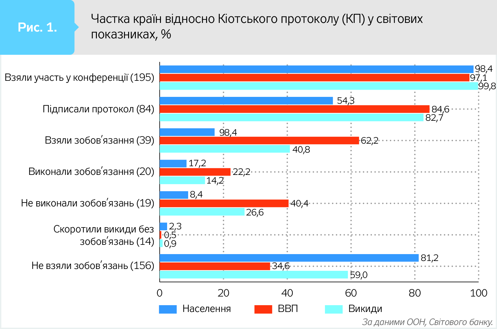 Тим часом поведінка США та інших країн, які підписали й не ратифікували протокол, а також тих, які ратифікували, але не взяли зобов'язань, негативно позначилася на виконанні Кіотського протоколу й істотно знизила його результативність. Так, половина країн, які взяли зобов'язання, - не виконали їх. При цьому частка цих країн, за обсягом ВВП та викидів у світових показниках, майже вдвічі більша, ніж тих, котрі виконали зобов'язання (рис. 1).