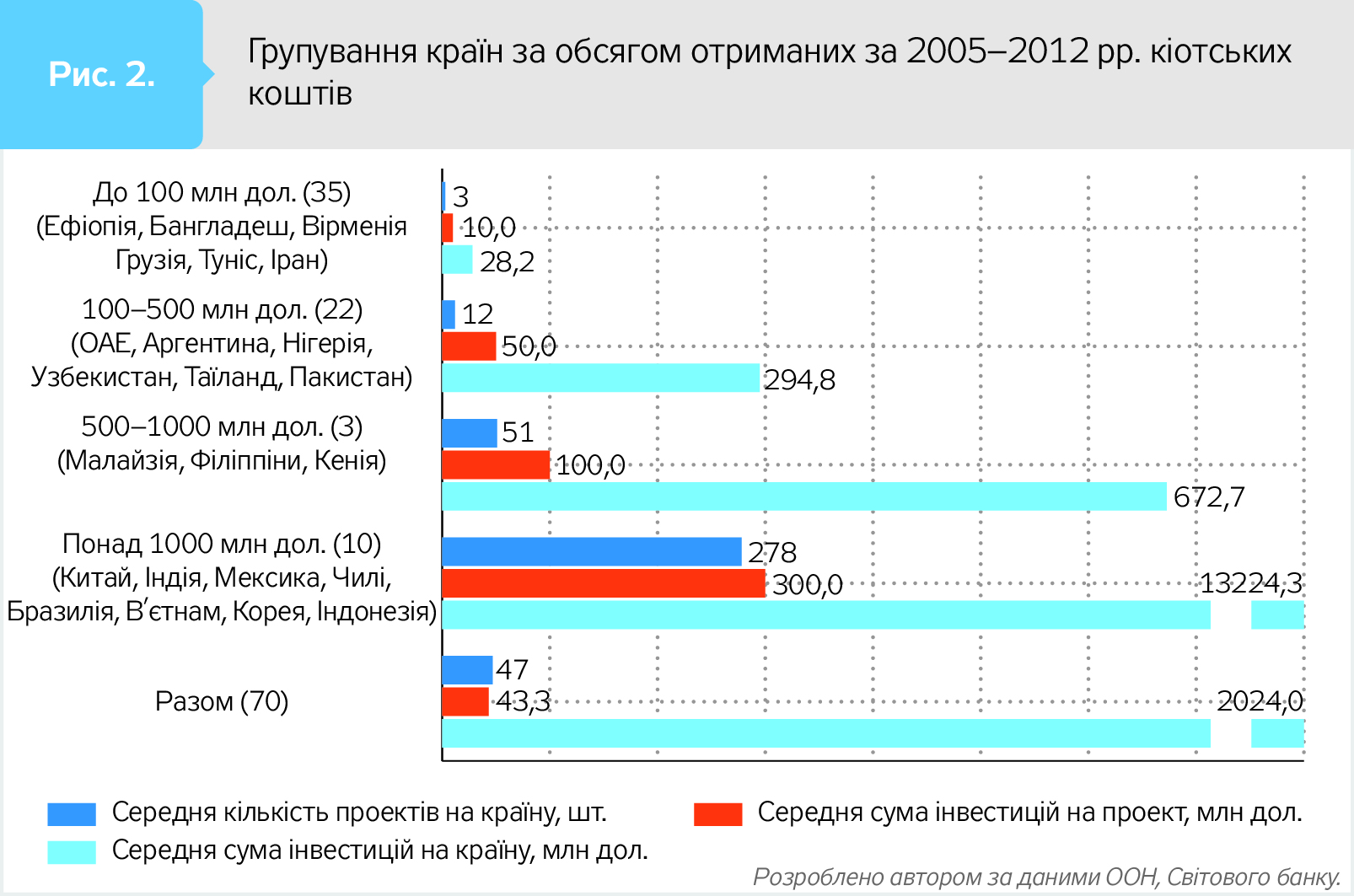 Але найсерйозніші проблеми виявились у розподілі кіотських коштів. Про разючу строкатість у розподілі кіотських коштів свідчить їх покраїновий аналіз (рис. 2). Так, 10 країн (четверта група) отримали майже 95% коштів, у середньому по 278 проектів і по 13,2 млрд дол. кожна з середньою вартістю проекту - 300 млн дол. Усього на п'ять країн - Китай, Індію, Бразилію, Корею і Мексику - припадало понад 90%, у т.ч. на Китай - 83%. Тим часом половина країн (перша група) отримали менше 0,7% загальної суми коштів, усього по 3 проекти і по 28 млн дол. на країну з середньою вартістю проекту - 10 млн дол.