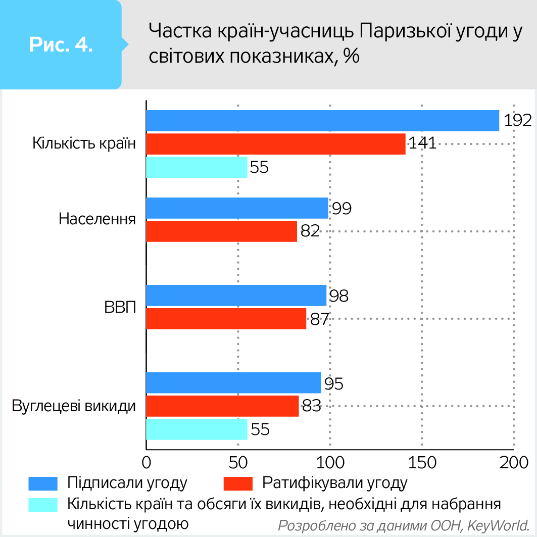 Паризька кліматична угода мала врахувати прорахунки Кіотського протоколу. І основний недолік був врахований - максимальне охоплення угодою країн-продуцентів викидів. Угоду підписали 195 країн, з яких 141 ратифікувала впродовж 2016 р. Це втричі більше, ніж було потрібно для набрання угодою чинності в листопаді 2016 р. Отже, перше досягнення Паризької угоди очевидне - це успішний процес ратифікації, який перевершив усі очікування. Так, угодою передбачалося, що вона набере чинності лише за умови, якщо її ратифікують не менше 55 країн, які виробляють не менше 55% світових викидів. Угоду вже ратифікували країни, в яких проживає 82% населення світу, і вони дають 87% світового ВВП та 83% світових викидів (рис. 4). Тим самим досягнуто дотримання першого важливого принципу глобальної кліматичної політики - охоплення угодою всіх країн-продуцентів викидів.