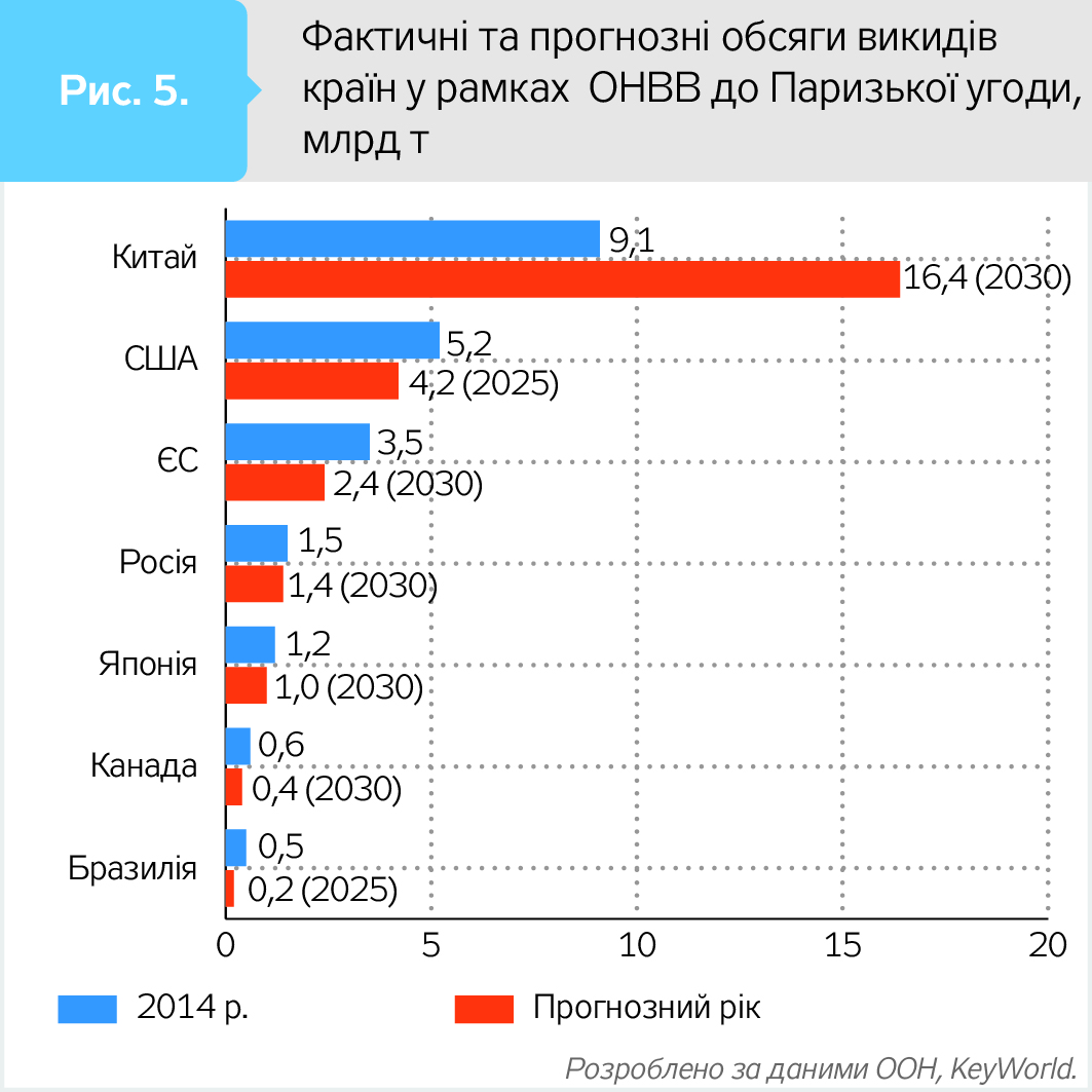 Наразі серйозною проблемою залишається реалізація другого важливого принципу глобальної кліматичної політики - обов'язковості та вагомості зменшення викидів в абсолютних і відносних (у співвідношенні до ВВП) вимірах. Дотримання цього принципу поки що поставлене на добровільну основу - це декларування країнами своїх очікуваних національно-визначених внесків (ОНВВ) у зменшення глобальних викидів, які мають бути амбітними та постійно зростати. Але поки що справи тут далеко не оптимістичні (рис.5).