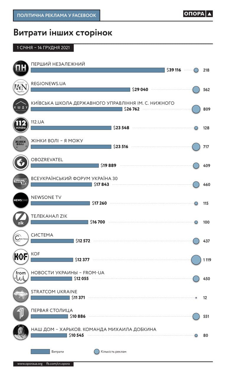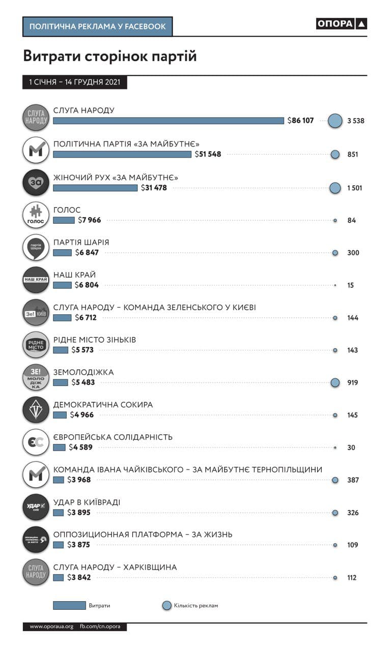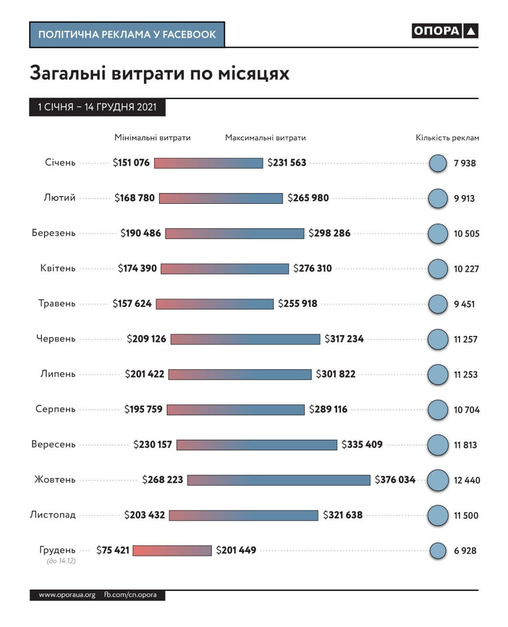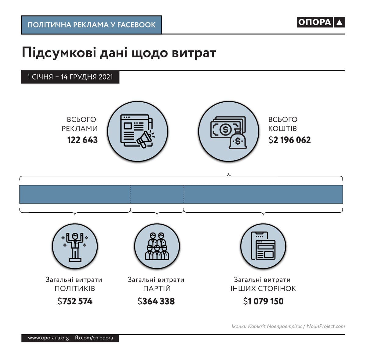 З 1 січня по 14 грудня 2021 року політичні сили, політики та інші сторінки опублікували у Facebook та Instagram майже 123 тисячі рекламних дописів політичного змісту. Їхня загальна вартість сягнула майже 2,2 млн дол. (близько 60 млн грн). Показово, що найбільшу частку цих витрат (49,1%) становлять витрати «інших» сторінок (тобто онлайн-видань, громадських рухів або ж таких, що підтримують певні політичні сили чи політиків, але не є їхніми офіційними представництвами). Вони витратили на політичну рекламу 1,08 млн дол. (29,5 млн грн). Наступними за витратами стали українські політичні діячі різних рівнів — від колишнього премʼєр-міністра Арсенія Яценюка до депутатів місцевих рад. На власне просування у Facebook вони сукупно витратили близько 753 тис. дол. (20,5 млн грн), тобто 34,3% загальних витрат на політичну рекламу в цій соціальній мережі. Найменшу частку (16,6%) становлять витрати політичних партій: за політичну рекламу вони заплатили 365 тис. дол. (близько 10 млн грн).