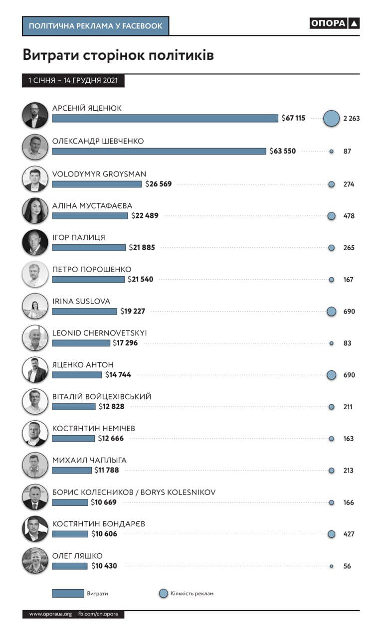 Уже традиційно лідерство за витратами на онлайн-рекламу утримує Арсеній Яценюк, — за 2021 рік він витратив майже 70 тис. дол. на понад 2200 рекламних дописів. Ця сума переважає витрати майже всіх сторінок політичних партій. З невеликим відривом другу сходинку посідає Олександр Шевченко, що навесні 2021 року балотувався в народні депутати України від 87-го округу (Івано-Франківщина). Він витратив понад 63 тис. дол. на 875 рекламних дописів.