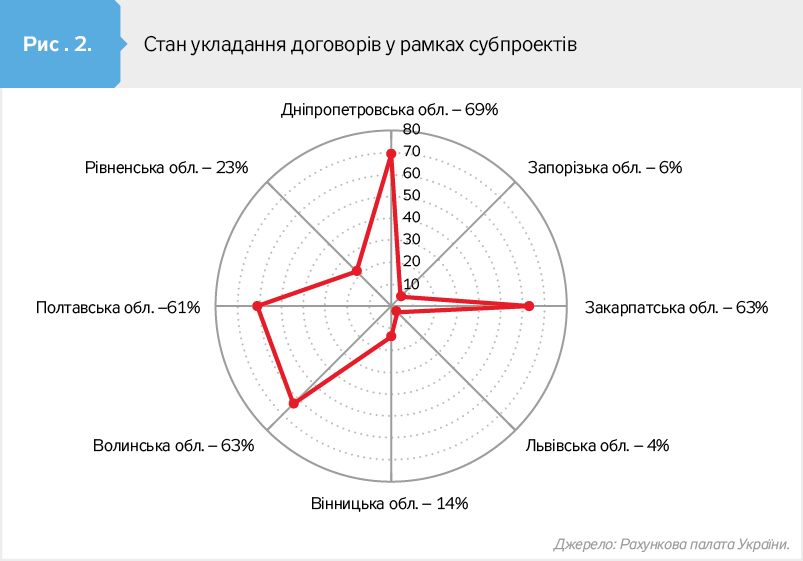 Зате 50 договорів вартістю майже 3 млн дол. облдержадміністрації уклали на надання послуг з планування й проведення закупівель, управління фінансами, адміністрування договорів, моніторингу та звітності в рамках проектів. Витрати на оплату цих послуг уже становлять майже 60% від загального обсягу витрат за проектом у регіонах.