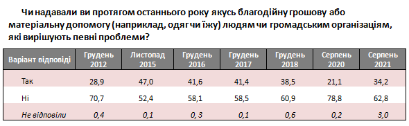 Також, згідно з опитуваннями Фонду «Демократичні ініціативи», близько третини громадян говорять, що вони надають благодійну грошову або матеріальну допомогу людям чи громадським організаціям, які вирішують певні суспільні проблеми (див. табл.).