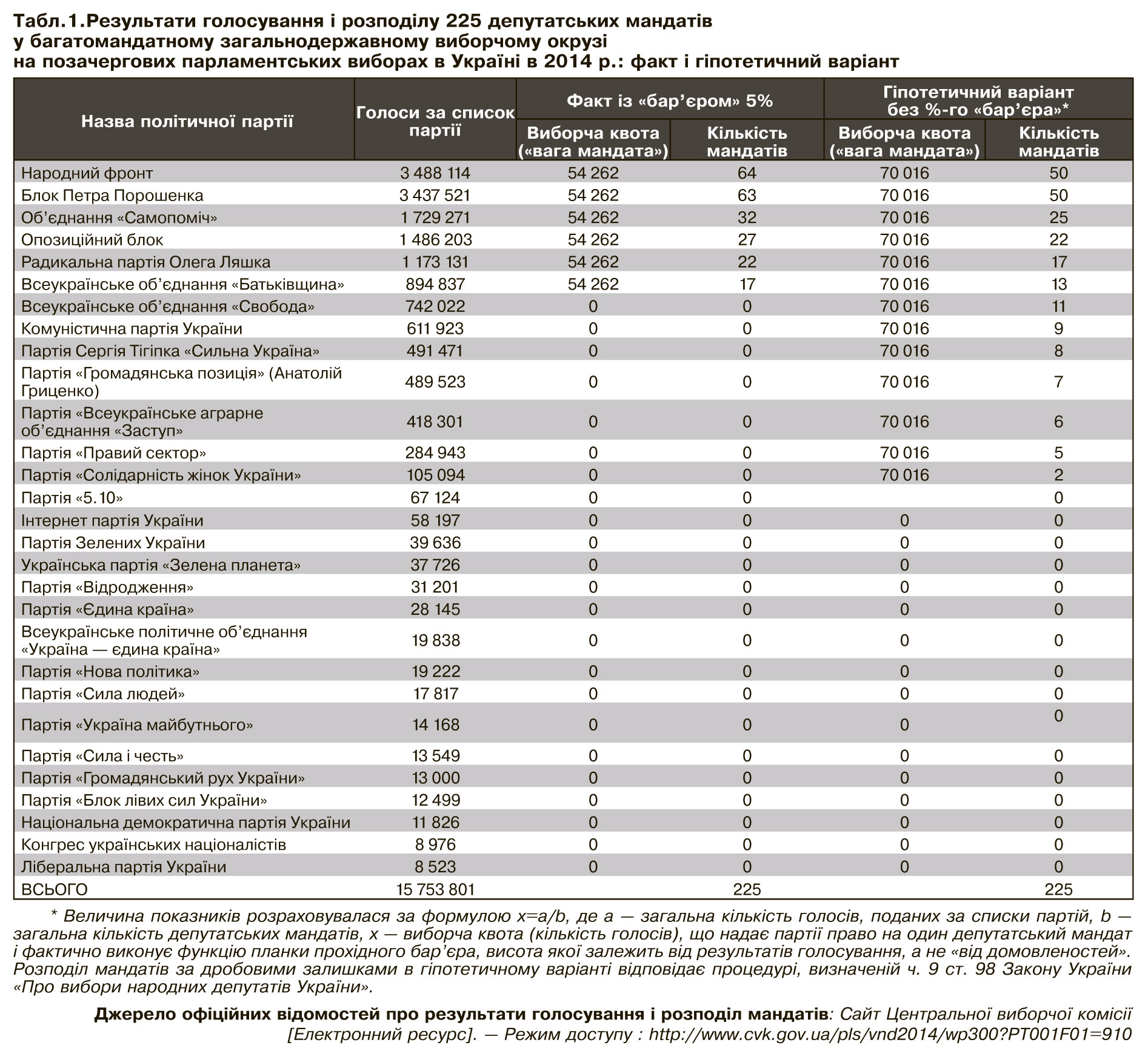 Згідно з даними таблиці у 2014 р. були позбавлені права брати участь у розподілі депутатських мандатів партії, за кандидатів яких проголосували понад 3,5 млн українців - 22,5% від 15,7 млн українців, які взяли участь у виборах і чиї бюлетені було визнано дійсними. Подані ними голоси за близькі їм політичні партії були, фактично, передані на користь партій з відмінними ідеологічними і політичними орієнтаціями, програмними засадами тощо. Можна легко обчислити величини своєрідного "призового фонду" тих, що здолали бар'єр. Для цього достатньо порівняти результати фактичного розподілу депутатських мандатів з гіпотетичними розрахунками за тим самим законом, але без 5-відсоткової "перешкоди": "Народний фронт" - 14 "призових" місць у Верховній Раді, БПП - 13, "Самопоміч" - 7, Опоблок - 4.