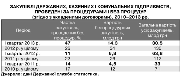 Якщо в перших кварталах 2011-го та 2012-го середня частка безпроцедурних закупівель становила близько 13%, то в першому кварталі 2013 р. - мало не вчетверо більше: майже половину! Якби цей показник залишався незмінним, то вартість усіх безпроцедурних закупівель держпідприємств становила б близько 4 млрд грн.