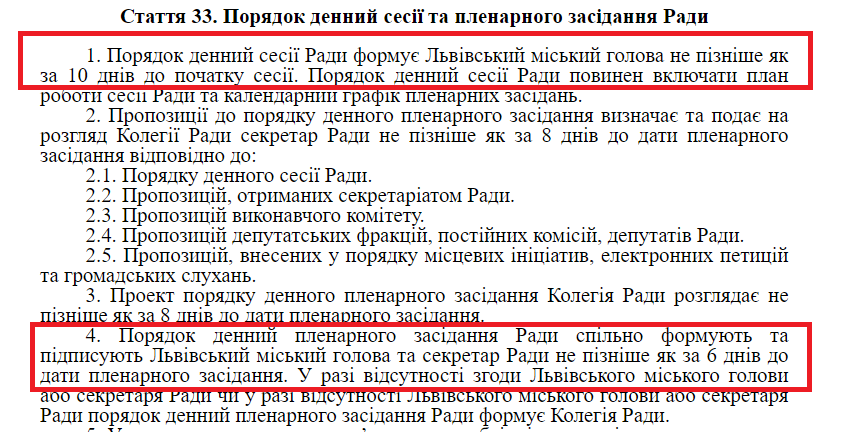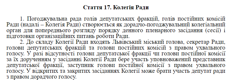 Також згідно з новим регламентом створено знову колегію ради, до якої увійшли голови фракцій, комісій, міський голова і секретар. І порядок денний має бути погоджений із колегією ради, де більшість теж у ЄС, «Варти» і «Свободи». Обклали мера з усіх боків. Цей орган існував раніше, але його робота велася непублічно.