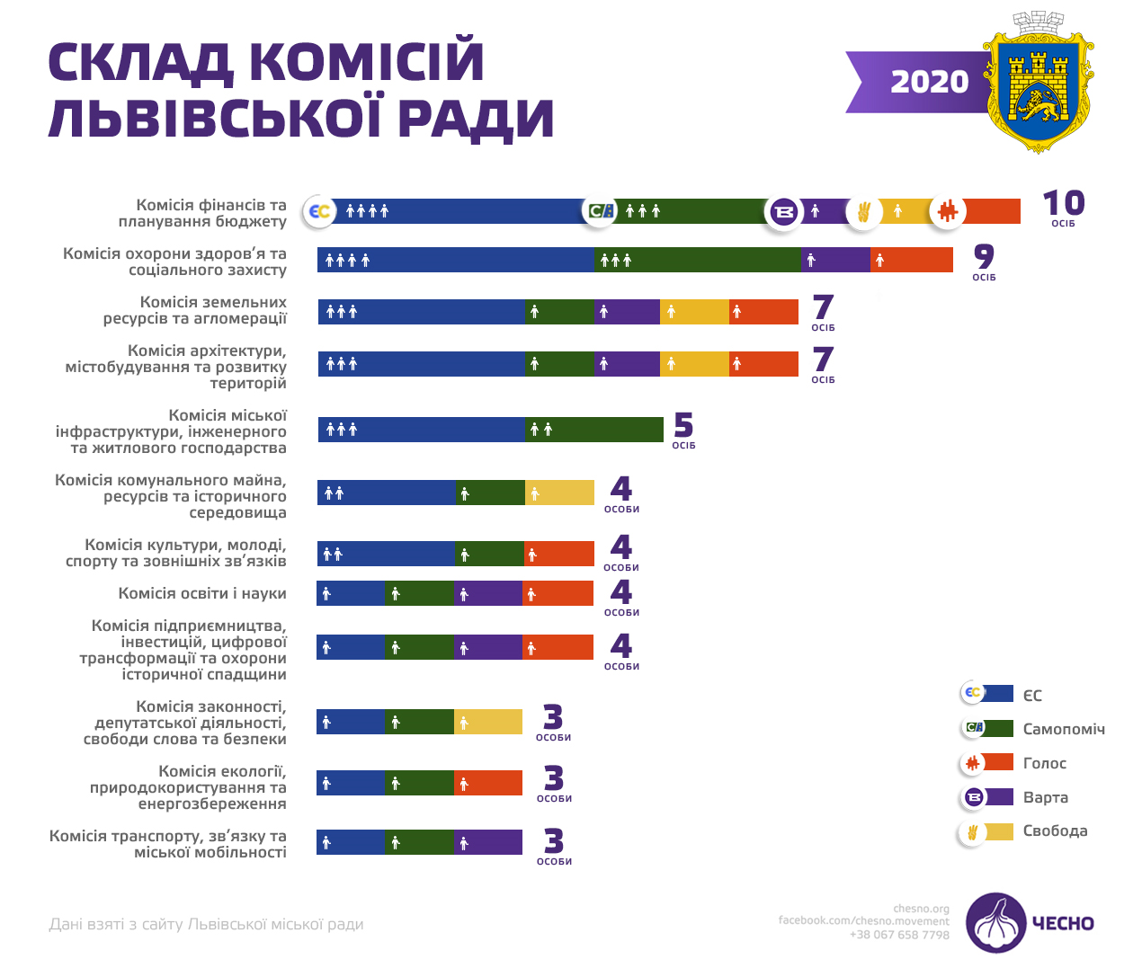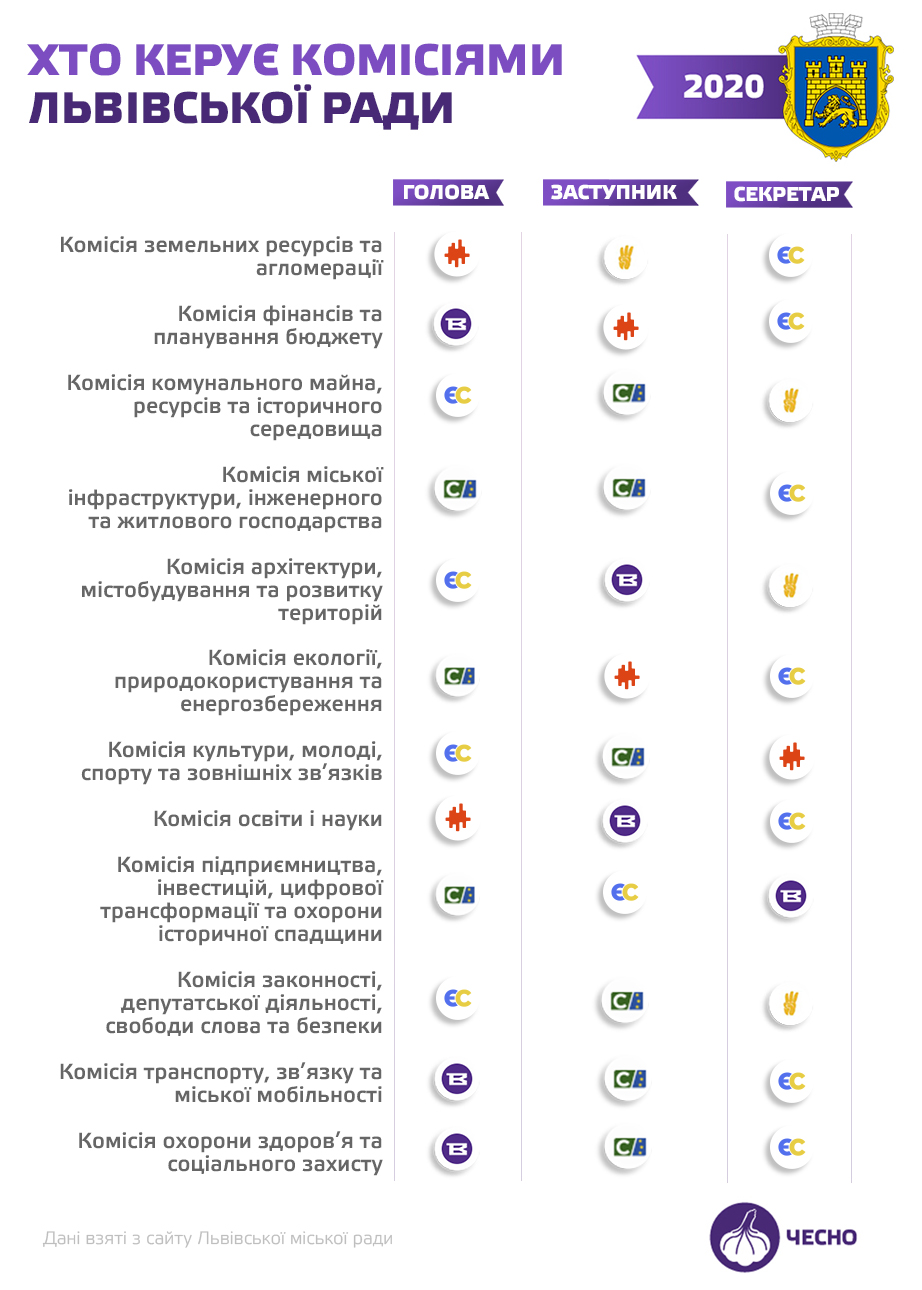 У львівській міській раді бюджетну комісію очолила представниця фракції «Варти» Наталія Шелестак, заступником голови комісії став Віталій Троць із фракції «Голосу» (до речі, потенційного носія чотирьох голосів на користь відсторонення Садового), а секретарем — Юрій Гринів із ЄС. Рух ЧЕСНО вже писав, що Шелестак і Гринів потрапляли в медійні скандали, що були пов’язані з майновими чи грошовими питаннями. Шелестак же, як свідчать коментарі представника фракції, в рамках коаліційних перемовин пропонували не лише цю комісію, а й посаду секретаря Львівської міськради.