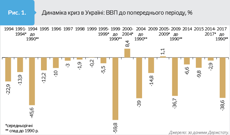 Однак у 2009 р. Україна опинилася в глибокій кризі: спад ВВП становив 14,8%. Це був найгірший показник серед постсоціалістичних країн, і він свідчив про те, що влада не змогла захистити українську економіку від світової кризи. Те саме повторилось у 2014–2015 рр., коли спад ВВП сумарно становив 16,4%. Цього разу це була вітчизняна криза, зумовлена російською агресією і війною. Хоч і тут є питання щодо адекватності реакції влади та ефективності захисту економіки.