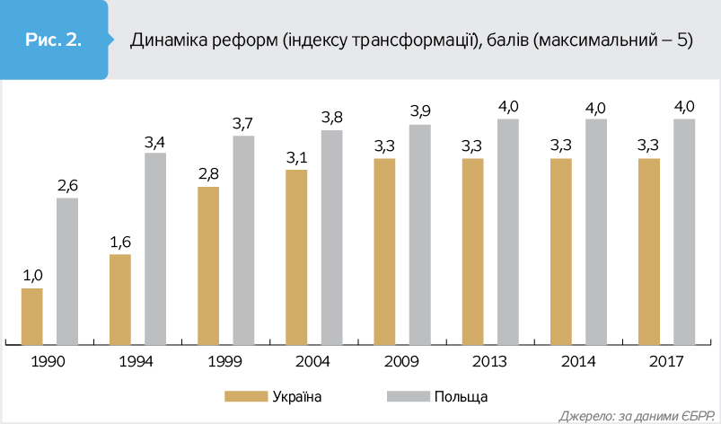 За десять років президентства Л.Кучми було здійснено близько 100 секторальних реформ. При цьому йдеться не про дріб'язкові удосконалення на кшталт зміни порядку реєстрації транспортних засобів, а про зміну базових засад економічних відносин. Було проведено приватизацію та корпоратизацію підприємств, здійснено грошову, бюджетну, податкову і митну реформи, низку реформ у галузях енергетики та промисловості, сформовано сектори середнього та малого бізнесу, створено банківську, фінансову та ринкову інфраструктури. Особливо успішними були мала приватизація, земельна й аграрна реформи, які одразу дали позитивні результати. Було також започатковано реформи у житлово-комунальній, соціальній та інших сферах. Підтвердженням цього є індекс прогресу трансформації, який щорічно розробляє ЄБРР і яким користуються Світовий банк і МВФ. В Україні в 1995–2004 рр. цей індекс практично подвоївся, а розрив між Україною і Польщею скоротився майже вдвічі. У подальші роки змін уже не було (див. рис. 2).