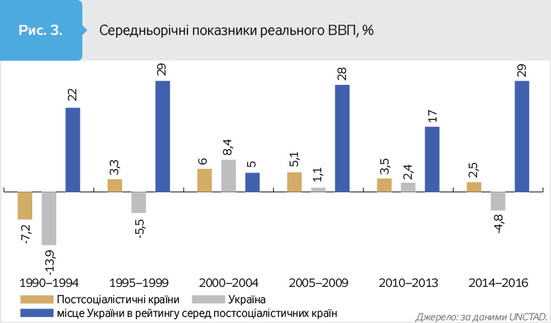 Загалом результати реформ за президентства Л.Кучми перевершили всі очікування. За 2000–2004 рр. у середньому за рік ВВП України зростав на 8,4%. Тоді наша країна посідала п'яте місце серед постсоціалістичних країн і перше - в 2004-му (12,1%). В інші періоди Україна займала останні або близько до останніх місця (див. рис. 3).