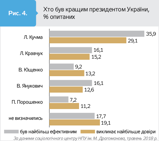 Характерно, що такі економічні результати діяльності президентів України адекватно сприймаються громадянами, про що свідчать результати опитування на тему: "Хто був кращим президентом України?". У Л.Кучми виходить найвища оцінка довіри і значно вищий рейтинг ефективного президента (див. рис. 4).