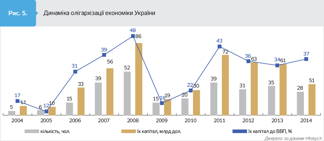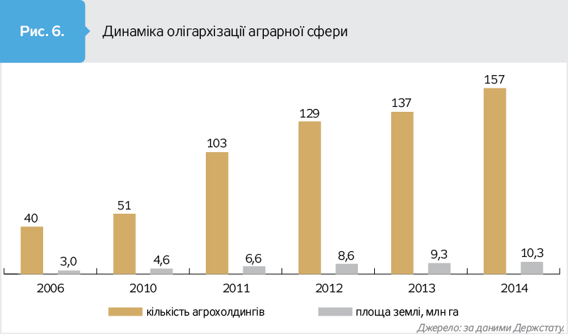Відповідь на друге запитання, коли розквітла олігархізація, дуже коротка, оскільки дуже наглядна з рис. 5. У 2008 р. показники олігархізації у 5–10 разів перевищували показники 2004-го. До речі, спочатку у 2005 р. вони були дещо впали, але потім різко пішли вгору. Звідси видно, коли розквітла олігархізація. Це підтверджує динаміка олігархізації в аграрній сфері, якої за Л.Кучми ще зовсім не було. Йому, навпаки, дорікали паюванням землі та майна колгоспів і радгоспів, яке начебто руйнувало великі підприємства. Агрохолдинги - "молодші брати" промислових олігархій - стали виникати лише з 2005 р. (див. рис. 6). А головне, досі нічого не зроблено, щоб їх зупинити або унормувати. По них досі не прийнято жодного закону, ні "за", ні "проти". Але ж це та сама олігархізація, яка в соціальному значенні на селі ще страшніша, ніж у промисловості.