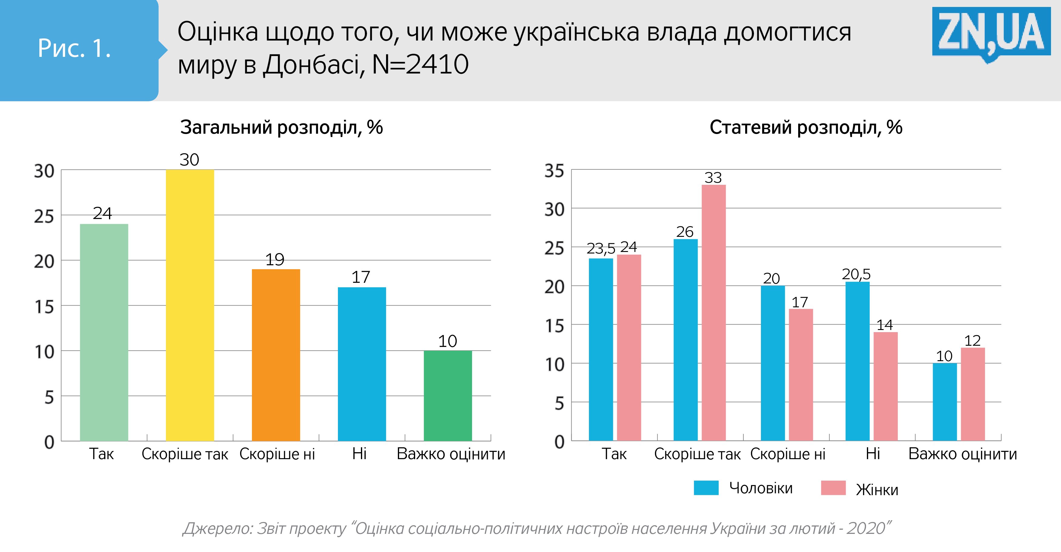 При цьому переважна більшість українців вважають, що найбільшою мірою мирний процес залежить від української влади, непохитно вірять, що їй удасться домогтися миру в Донбасі, навіть менше чверті респондентів - 24% (рис. 1). Ще 30% відповіли "швидше, так". Переконаних песимістів виявилося 17%, дуже сумніваються - майже п'ята частина (19%) (і на Сході таких більше, ніж в інших регіонах країни).