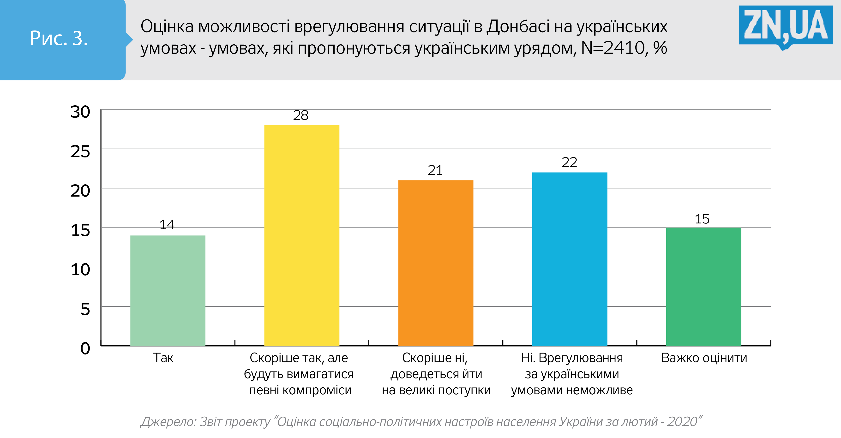 Мало оптимізму в наших співвітчизників і стосовно врегулювання в Донбасі на українських умовах: лише 14% вірять у таку можливість (рис. 3). Ще 28% відповіли "швидше, так, але знадобляться певні компроміси". 43% українців або взагалі не вірять в урегулювання на умовах, пропонованих українською владою (22%), або вважають, що це, швидше, неможливо, оскільки "доведеться йти на великі поступки" (21%). Песимістів у цьому питанні виявилося найбільше серед киян та жителів Сходу.