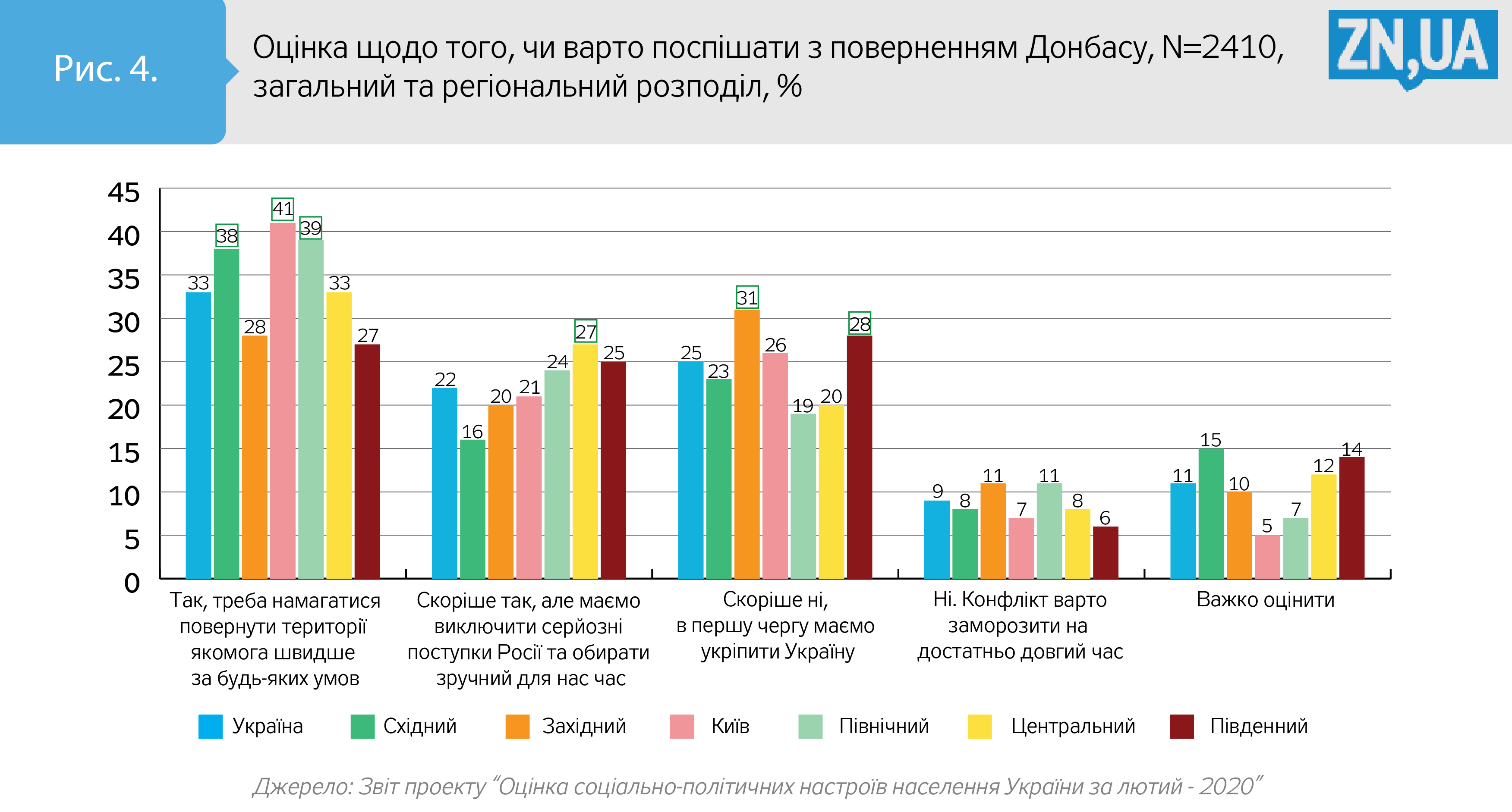 Однак при цьому саме респонденти з Києва (41%) і Східного регіону (38%), а також жителі півночі (39%), які примкнули до них, частіше за інших українців вважають, що необхідно намагатися повернути окуповані території Донбасу "якомога швидше за будь-яких умов". Загалом же, по Україні цей показник - 33%, тобто третина населення країни (рис. 4). Ще 22% респондентів відзначили, що треба поспішати з поверненням Донбасу, але при цьому необхідно "виключити серйозні поступки Росії і вибирати зручний для нас час". Таким чином, 55% наших співвітчизників - за якнайшвидше повернення непідконтрольних територій у лоно України. І лише чверть населення вважає, що, перш ніж повертати ОРДЛО, "насамперед необхідно зміцнити Україну". Переконаних, що конфлікт необхідно заморозити на досить тривалий час, зовсім мало - 9%.