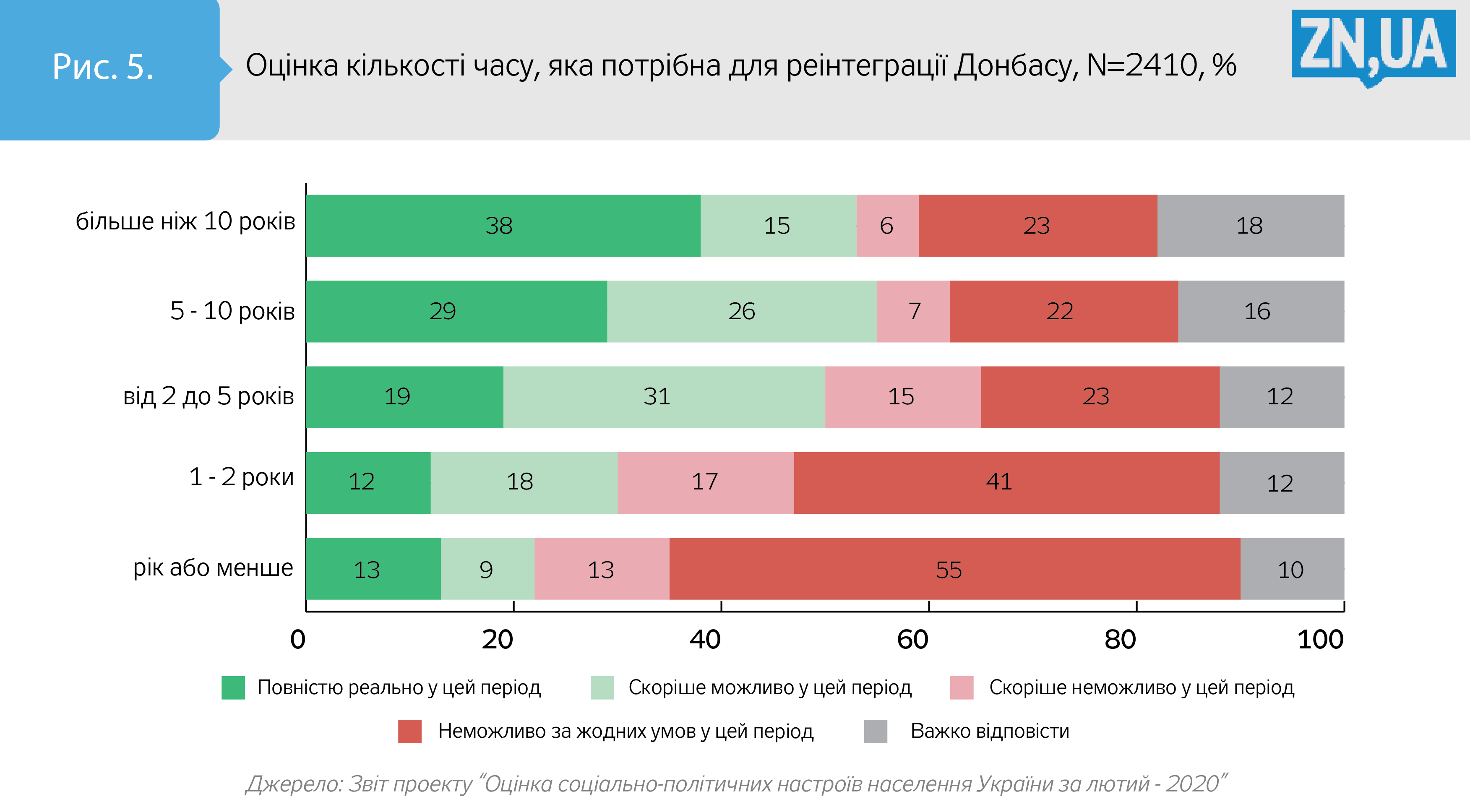 Якими ж бачать українці часові рамки реінтеграції Донбасу? При тому що третина країни - за якнайшвидше повернення окупованих територій, для 50% українців це не менш як 2–5 років (рис. 5). А найпопулярнішою стала відповідь "5–10 років", - реінтеграцію за такий період вважають можливою 55% респондентів. У тому, що окупований Донбас можна буде повернути за "більш ніж 10 років", переконані 38% респондентів плюс 15%, які відповіли "швидше, можливо". Кожен десятий відзначив, що "реінтеграція Донбасу не відбудеться ніколи", ще 7% думають, що цього не відбудеться, "швидше за все". Таких песимістів більше в Києві й на Сході України.