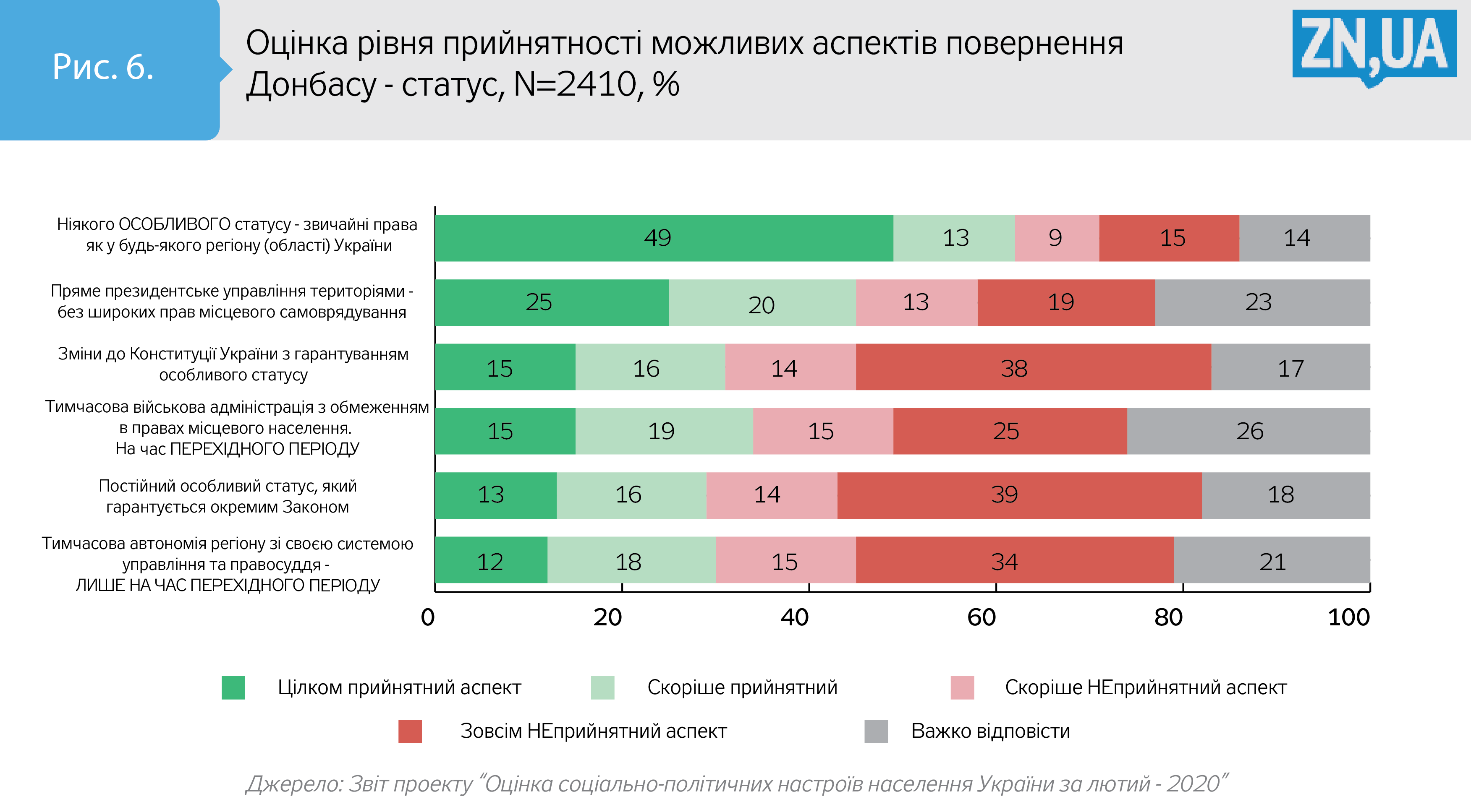 Тим часом майже половина українців - 49% - сприймають як абсолютно прийнятне повернення Донбасу без особливого статусу, зі "звичайними правами, як у будь-якого регіону/області України" (ще 13% вважають це, швидше, прийнятним, отож - 62%).