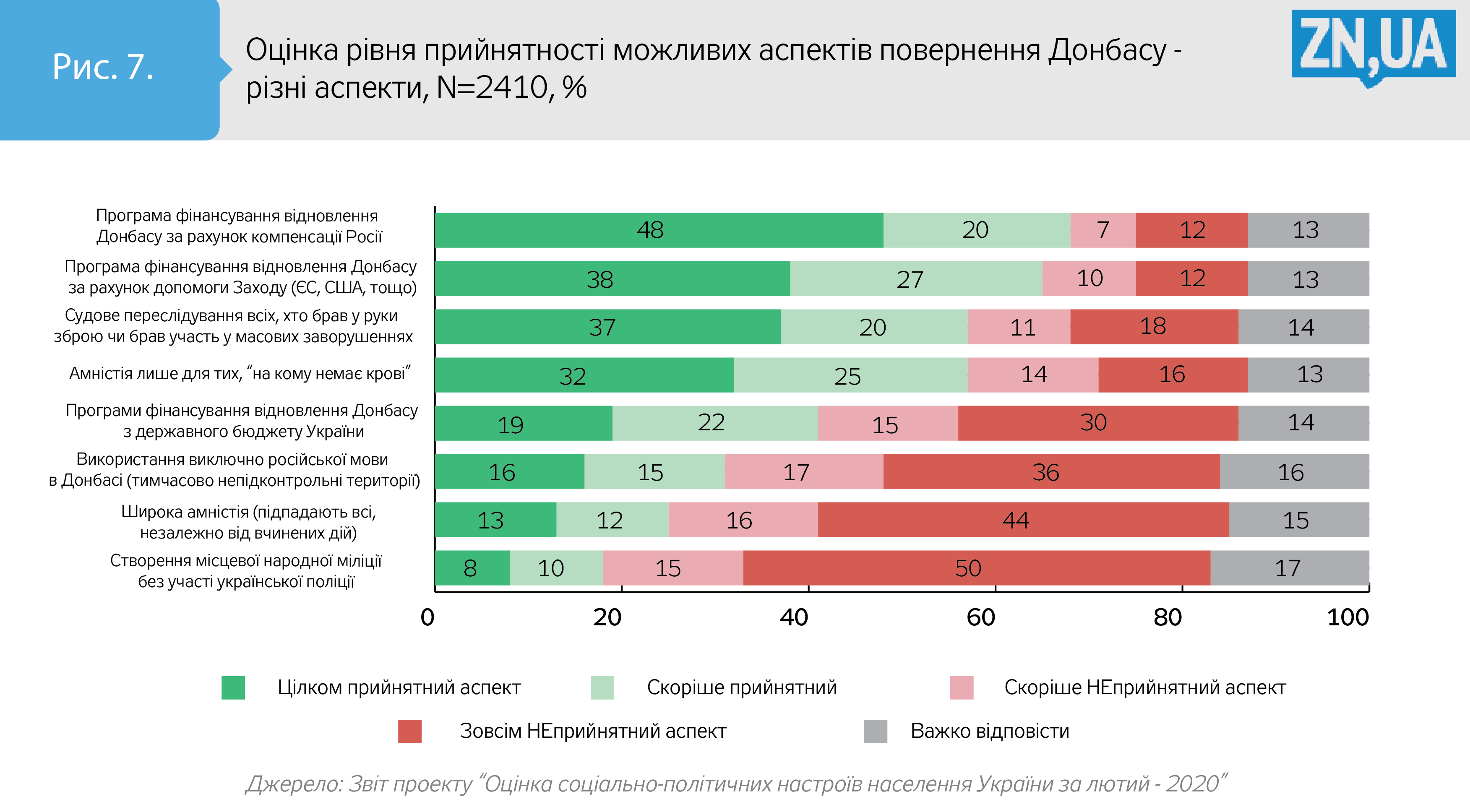 У рейтингу "переможних сценаріїв" "програма фінансування відновлення Донбасу за рахунок допомоги Заходу" (набрала 59%) на 10% випередила навіть "військову операцію, що завершиться розгромом формувань "ДНР/ЛНР", яку перемогою ("повною" або "швидше") назвали 49% учасників опитування.