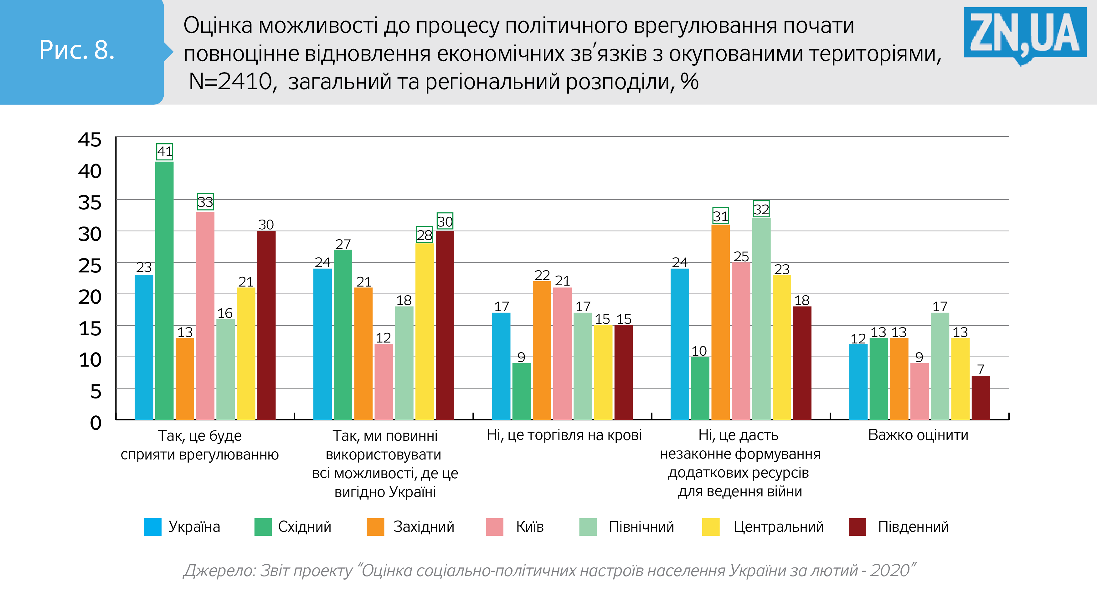Автори дослідження відзначають чималі регіональні відмінності у відповідях: на Сході та в Києві більшість респондентів зазначили, що відновлення економічних зв'язків до політичного врегулювання "можливо і сприятиме врегулюванню". Однак підкреслимо, якщо сумарна кількість "так" і "ні" киян, практично, однакова - 45 і 46%, відповідно, то жителі Сходу переважною більшістю виступають за відновлення економічних зв'язків із окупованими територіями - 68% проти 19%, які сказали "ні".