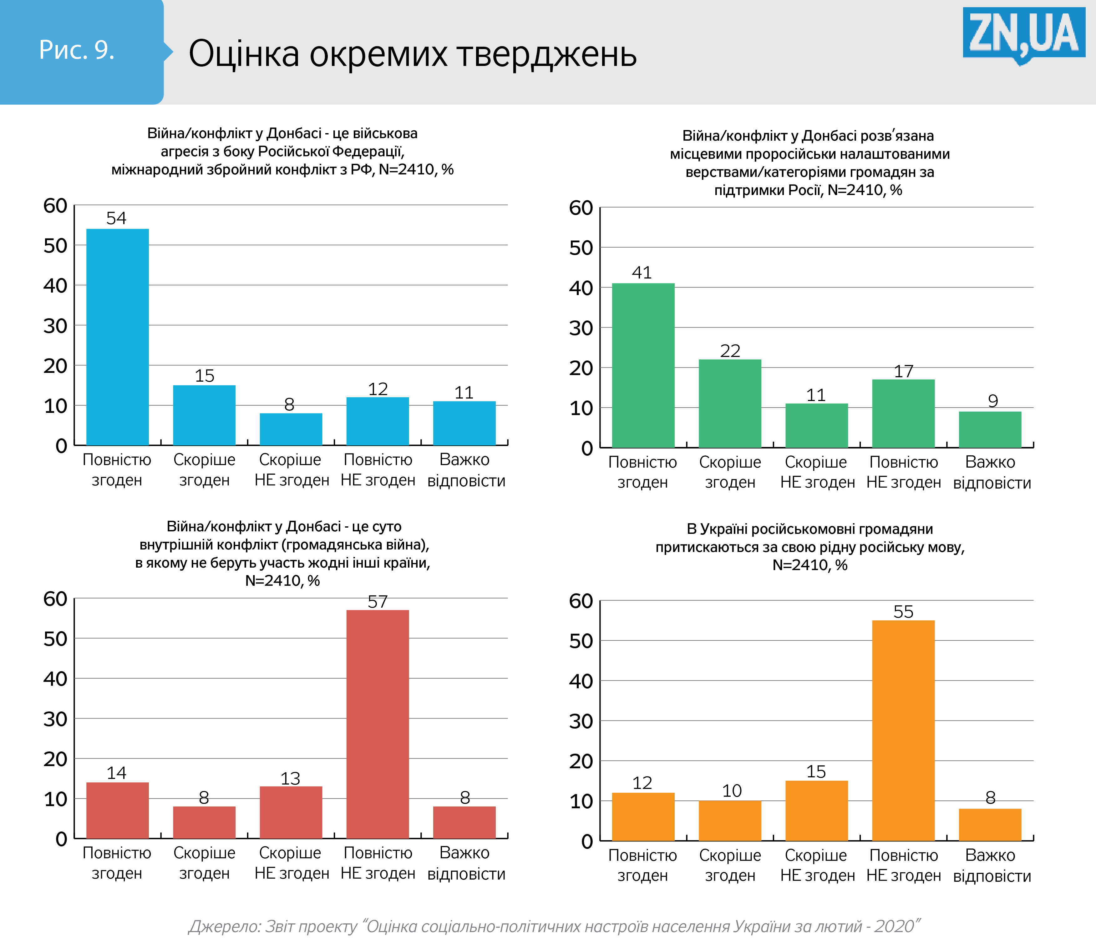 Отже, почнемо з основоположного: то що ж відбувається в Донбасі? Респондентам було запропоновано три можливі відповіді. Варіант "Війна/конфлікт у Донбасі - це військова агресія з боку Російської Федерації, міжнародний збройний конфлікт із РФ" підтримали 69% учасників опитування (54% - повністю, 15% - швидше) (рис. 9).
