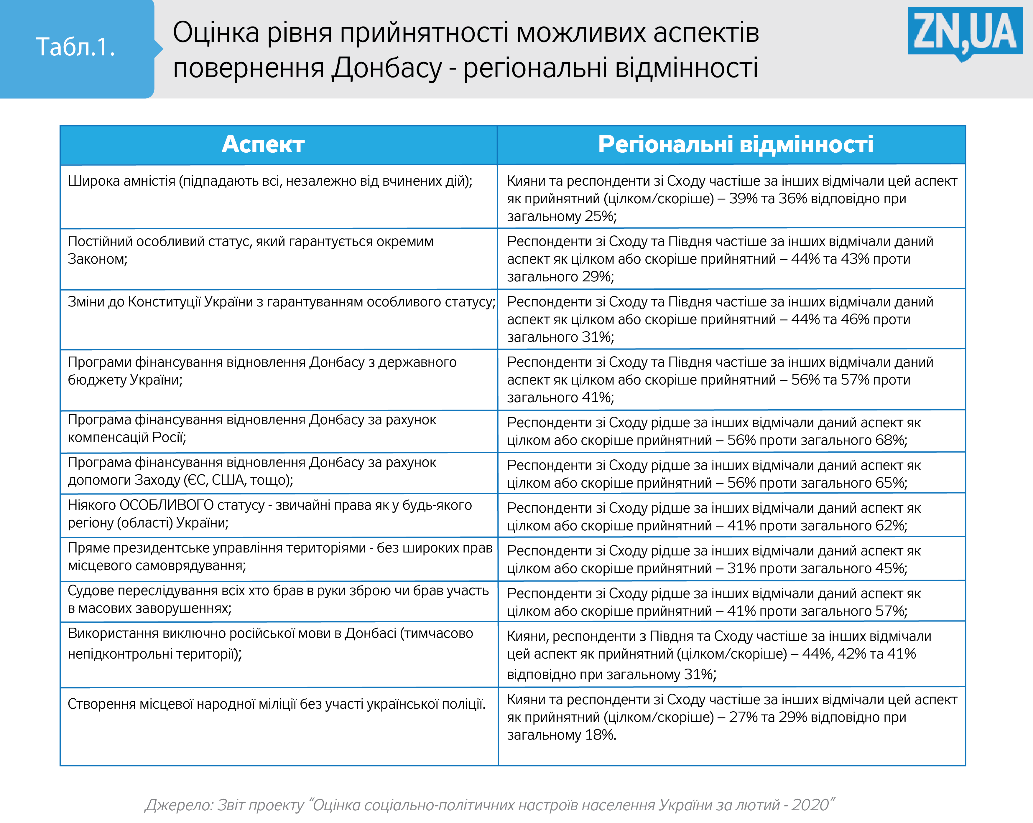 На підконтрольній території теж спостерігаються помітні відмінності у відповідях залежно від регіонів (табл. 1). Наприклад, українці зі Сходу рідше від інших - 41% проти загальних 57% - вважають прийнятним (цілком або швидше) судове переслідування всіх, хто брав до рук зброю. Кияни та жителі Сходу більше за інших готові сприймати широку амністію (39 і 36%, відповідно, проти загальнонаціональних 25%) і створення місцевої народної міліції в ОРДЛО (27 і 29% проти загальних 18%). Лояльніші в питанні російської мови, знову-таки, кияни, респонденти зі Сходу й Півдня (44, 42 і 41%, відповідно, проти 31% по країні). У цьому опитуванні, мабуть як у жодному іншому раніше, кияни часто відповідали в унісон із жителями Східного регіону. Хоча зазвичай як на загальнонаціональних виборах, так і під час опитувань, присвячених, наприклад, зовнішньополітичним пріоритетам, думка киян частіше збігається з поглядами українців із Заходу.