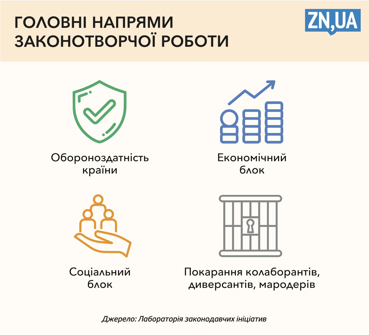 Покарання колаборантів, диверсантів, мародерів. Серед найважливіших ухвалених законопроєктів є:
