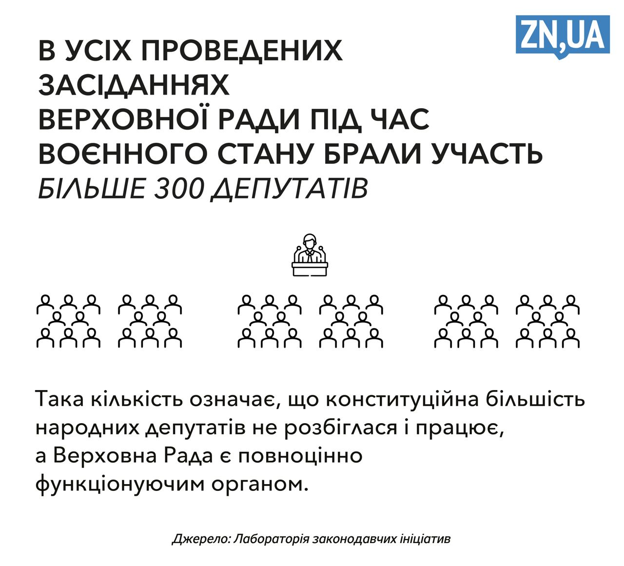 У всіх засіданнях Верховної Ради під час воєнного стану брали участь більше 300 депутатів. Така кількість означає, «конституційна більшість» народних депутатів не розбіглася і працює, а Верховна Рада є повноцінно функціонуючим органом.