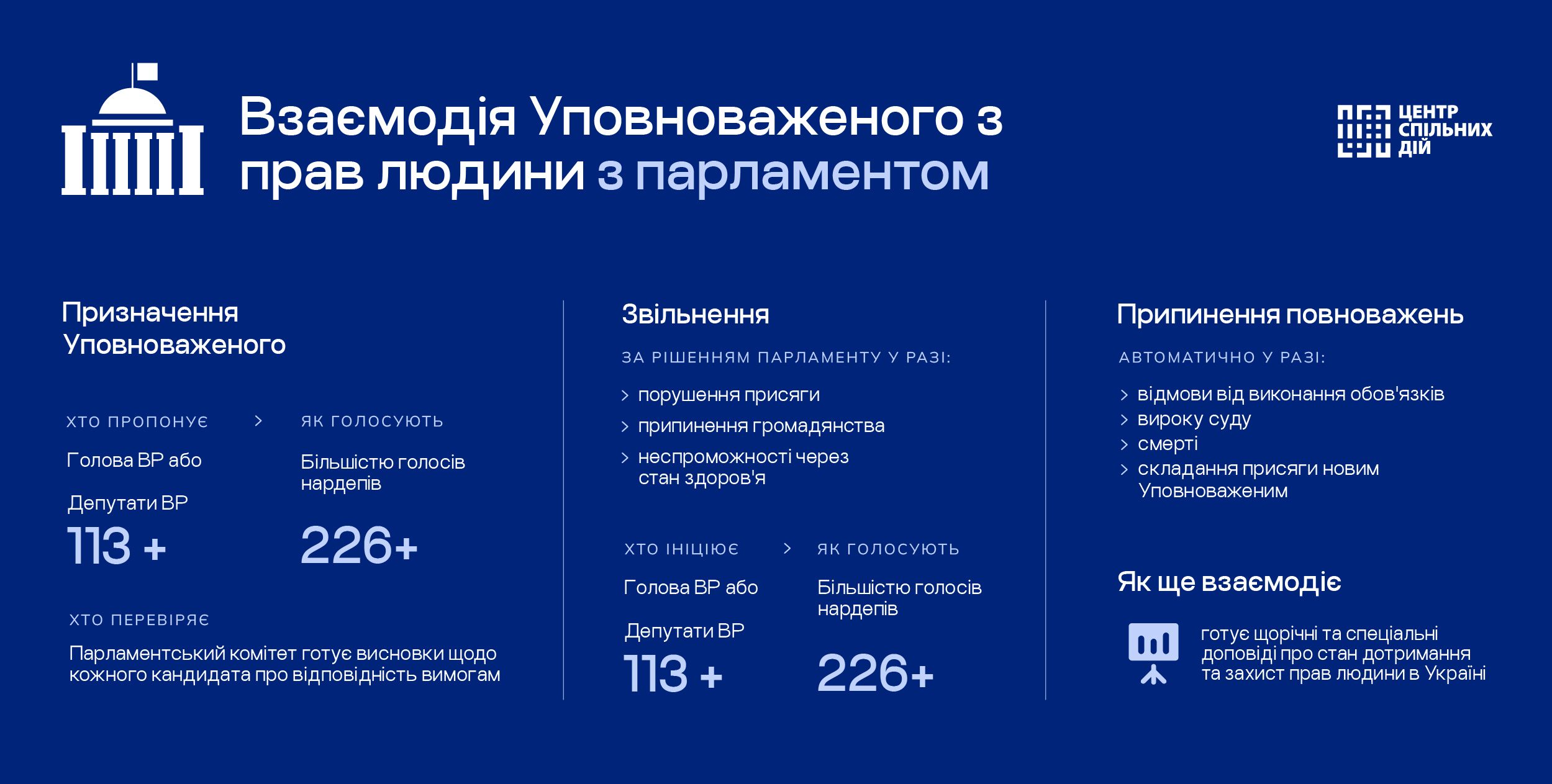 Саме зараз найкращий час, аби змінити цю практику. Точкові, але дійові зміни до законодавства можуть сприяти розвиткові інституції Уповноваженого з прав людини, підвищити її легітимність, довіру до неї, а отже й до держави загалом.