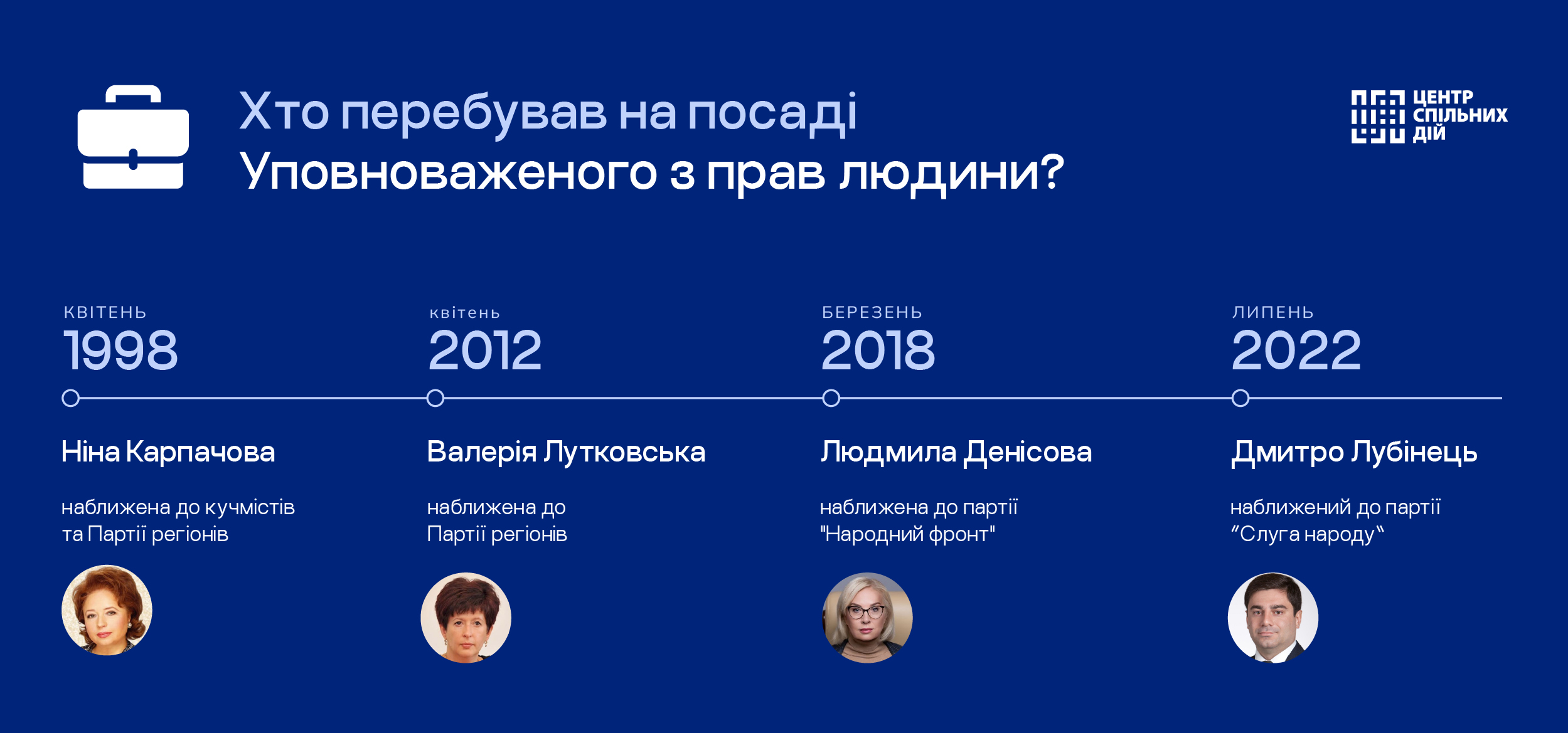 Почалася ця історія ще з першої Уповноваженої, Ніни Карпачової. Її призначили у 1998 році й перепризначали двічі. Як омбудсман вона пропрацювала 14 років. Перед цим була народною депутаткою, — у 1994 році її обрали як мажоритарницю з Криму.