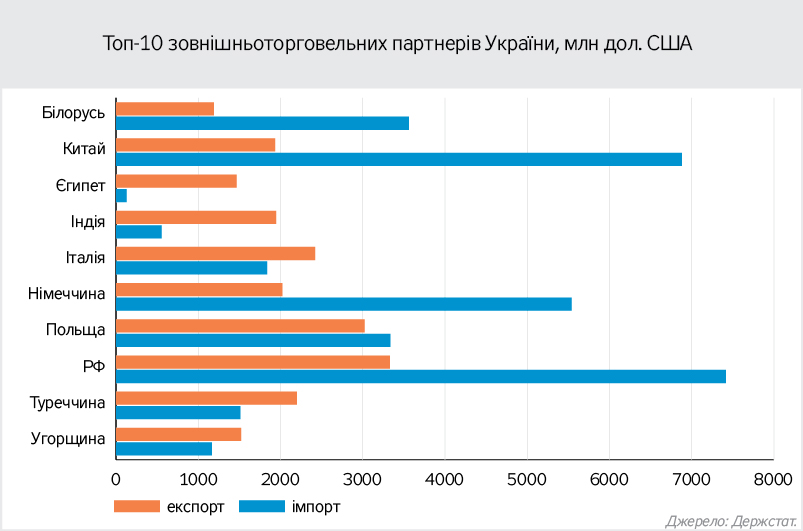 Якщо дивитися на топ-5 наших партнерів у зовнішній торгівлі, то ми купуємо товари у РФ (7,4 млрд дол.), Китаї (6,8 млрд), Німеччині (5,5 млрд), Білорусі (3,5 млрд), Польщі (3,3 млрд дол.). А продаємо товари РФ (3,3 млрд дол.), Польщі (3 млрд), Італії (2,4 млрд), Туреччині