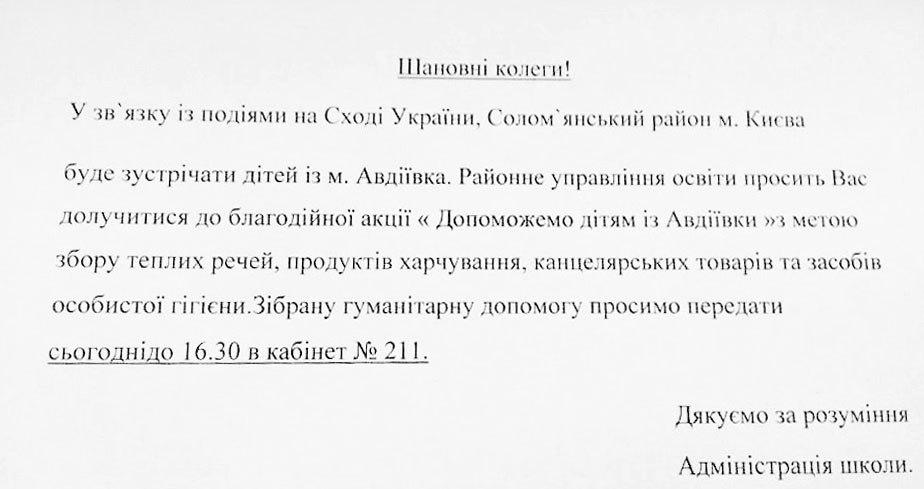 При цьому до пуття сказати, скільки дітей, куди оселили і чого конкретно вони потребують, учителі не змогли, посилаючись на телефонограму з відділу освіти. Там, своєю чергою, поняття не мають, звідки взялися ці діти. Стверджують, що допомогу збирали безпосередньо в Авдіївку, а якщо хтось там щось не зрозумів з телефонограми, то це недогляд на місці.