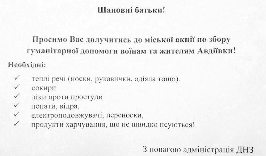 Завтра вранці привезуть евакуйованих дітей з Авдіївки. Прохання вранці передати через дітей (по можливості) теплі речі, іграшки, постільну білизну, рушники, крупи, печиво, засоби особистої гігієни. Спасибі".