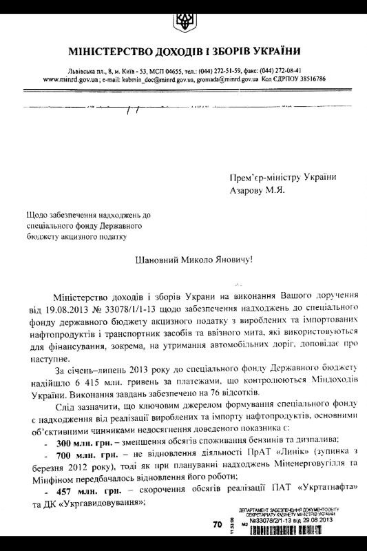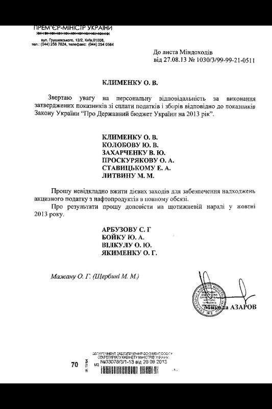 Згідно з супровідними документами до листа Міндоходів, Микола Азаров вказав О.Клименку на персональну відповідальність за виконання затверджених показників щодо сплати податків і зборів відповідно до показників закону про держбюджет на 2014 р. Прем'єр-міністр вимагав у жовтні 2013 р. доповісти про результати заходів, вжитих щодо забезпечення надходжень акцизного податку з нафтопродуктів у повному обсязі.