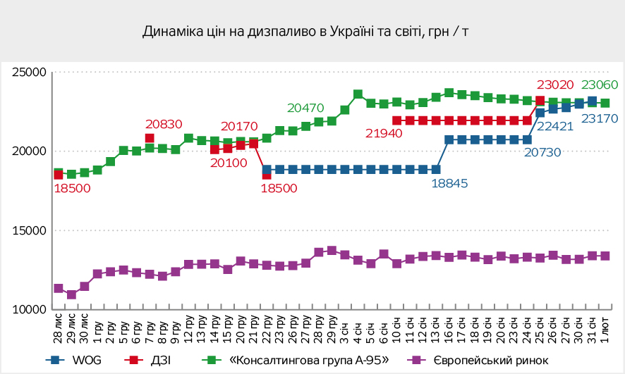 Але повернімося до нашого тендеру. Дані світових котирувальних агентств і "Консалтингової групи А-95" відповідно свідчать, що ні у світі, ні на внутрішньому ринку особливих коливань цін на дизельне паливо не було. Зазначу, що тут не враховано підвищення акцизного збору, оскільки цю поправку було окремо внесено до контрактів із ВОГ 16 січня ц.р.
