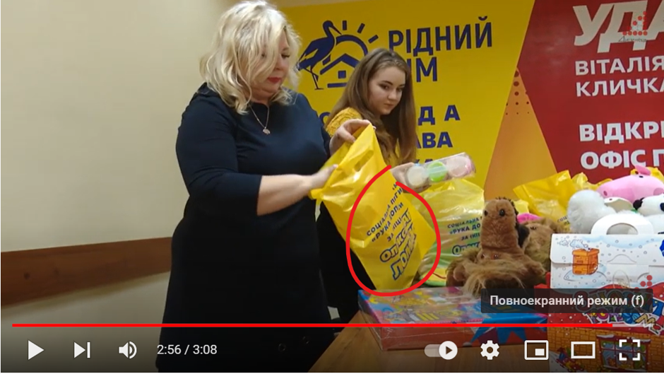 Такий самий синхрон є в сюжеті каналу «Дитинець». В обох випадках автори говорять, що подарунки для дітей збирали всі охочі жителі Чернігова. Тимчасом на відео видно, як роздають подарунки у пакетах із написом «Соціальна програма «Рука допомоги» Олександра Ломака».